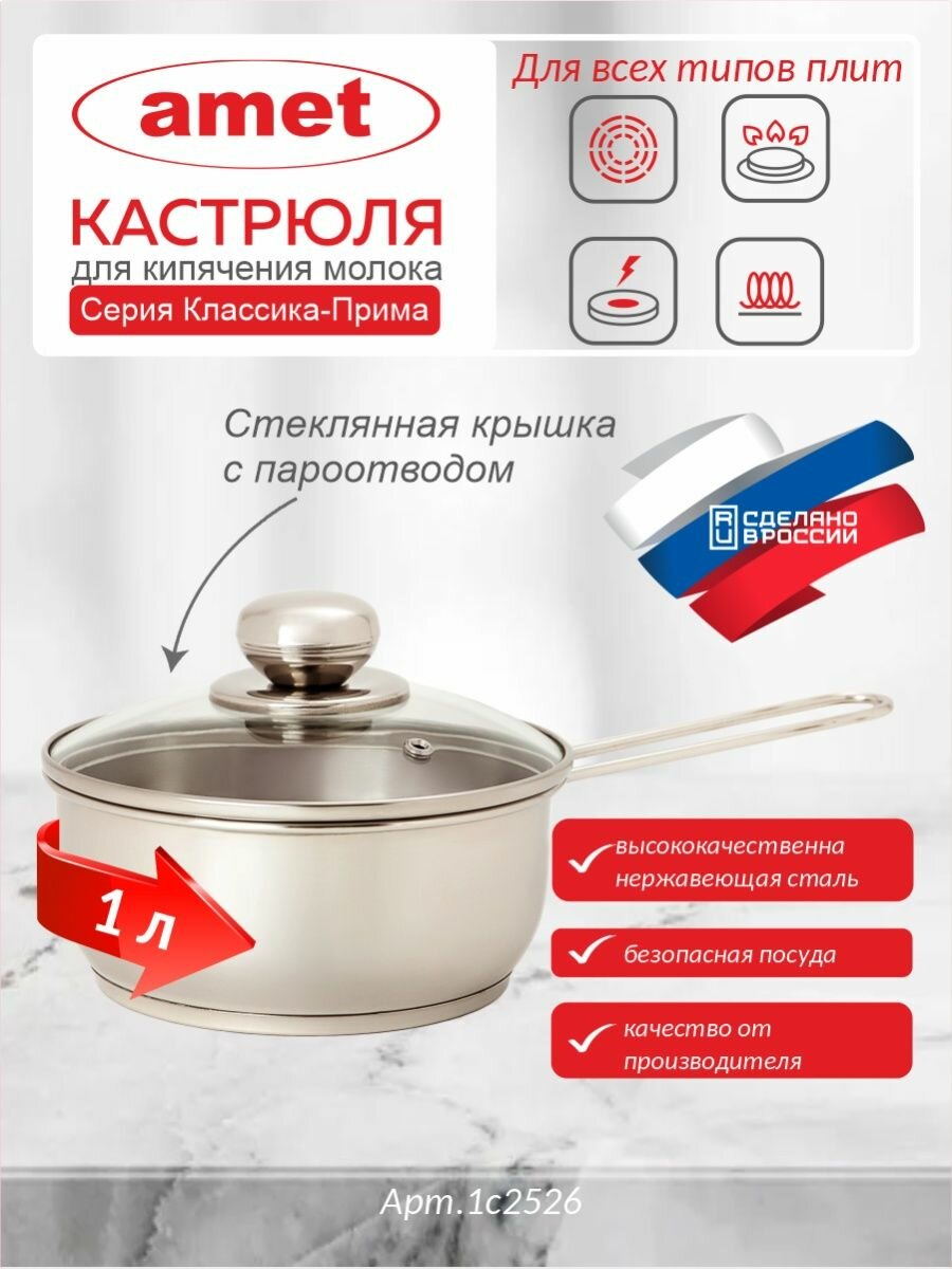 Кастрюля Амет "классика-прима" 1 л для молока со стеклянной крышкой