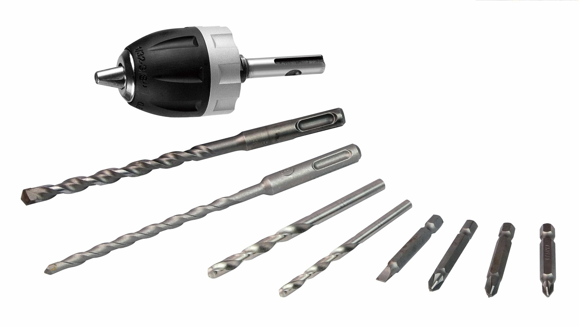 | Комплектация | два аккумулятора, зарядное устройство, быстрозажимной патрон, два сверла, два бура, биты - 4 шт., кейс |