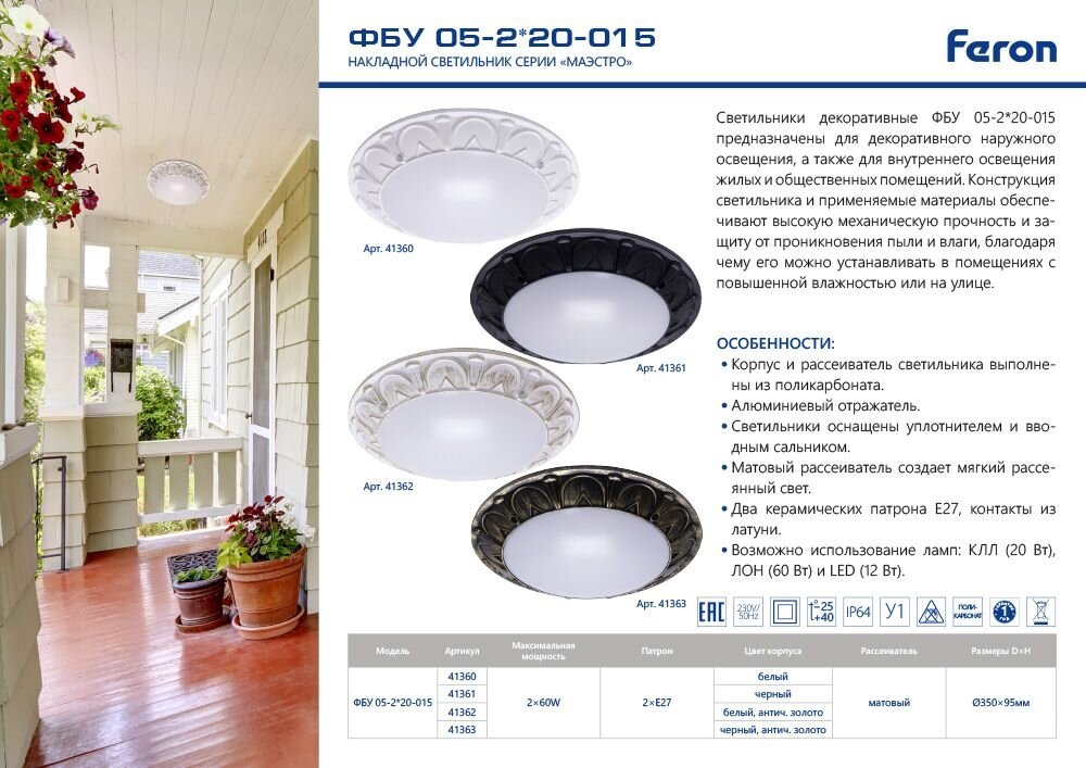 Feron ФБУ 05-2*20-015 Светильник накладной IP64, 220V, 2*60Вт 2*Е27, серии Маэстро, 41360