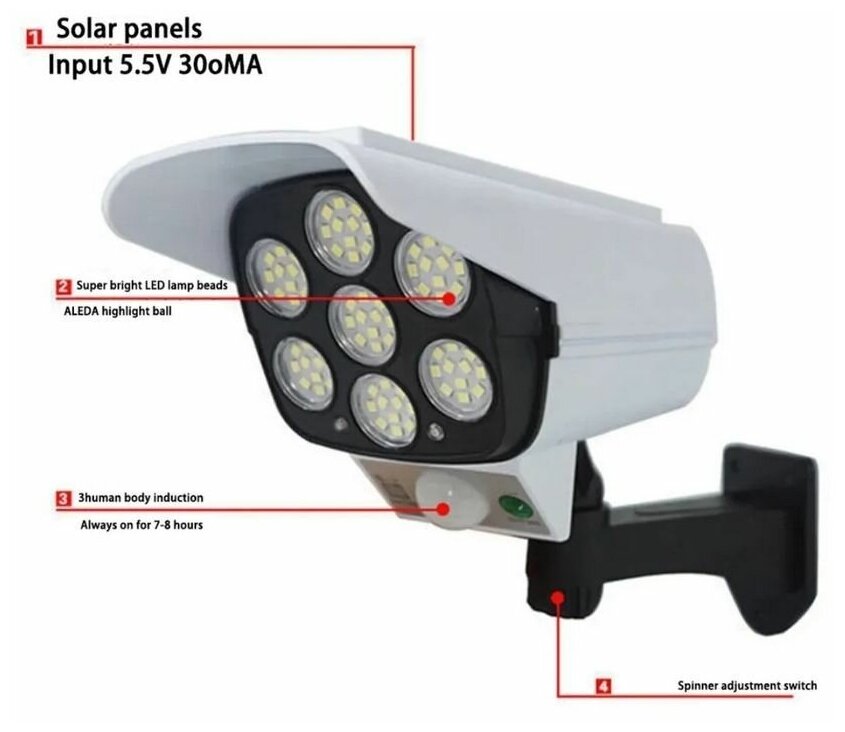| Плюсы: | Заряжается от солнечной энергии, довольно яркий, управление с пульта и на самом фонаре. Мигающий красный диод под камеру |