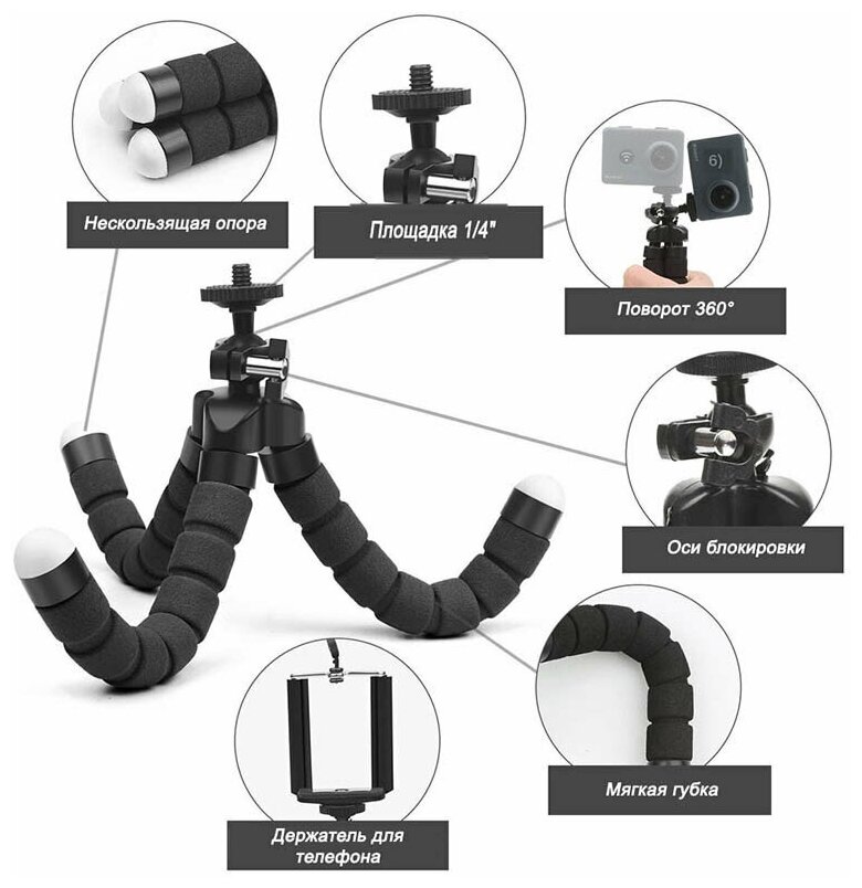 | Плюсы: | удобно фиксировать, как сам телефон к штативу, так и крепить штатив на рабочих поверхностях |