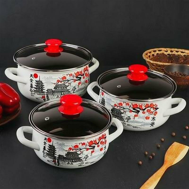Керченская эмаль Набор кастрюль «Ветка сакуры», 3 предмета: 1,5 л, 2 л, 3 л, стеклянная крышка