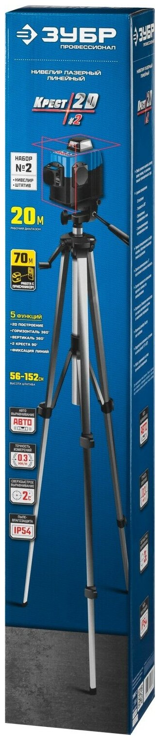 ЗУБР крест 2D №2 нивелир лазерный 2х360°, 20м/70м, точн. +/-0,3 мм/м, штатив 34907-2