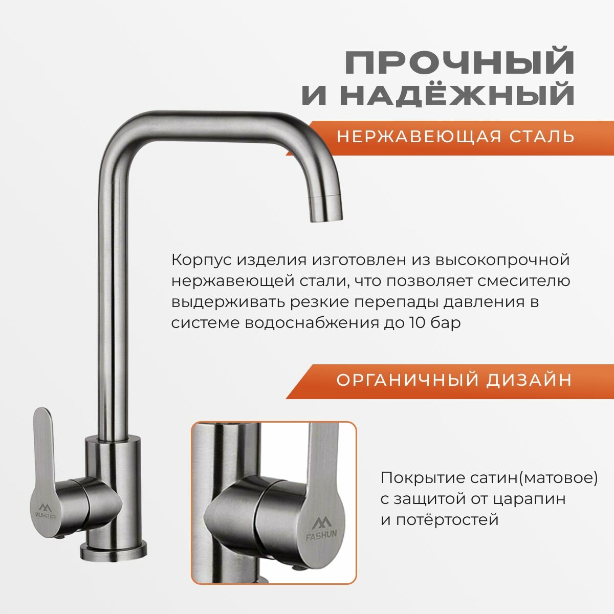 Смеситель для кухни с поворотным изливом, нержавеющая сталь, гибкая подводка в комплекте (Fashun, сатин)