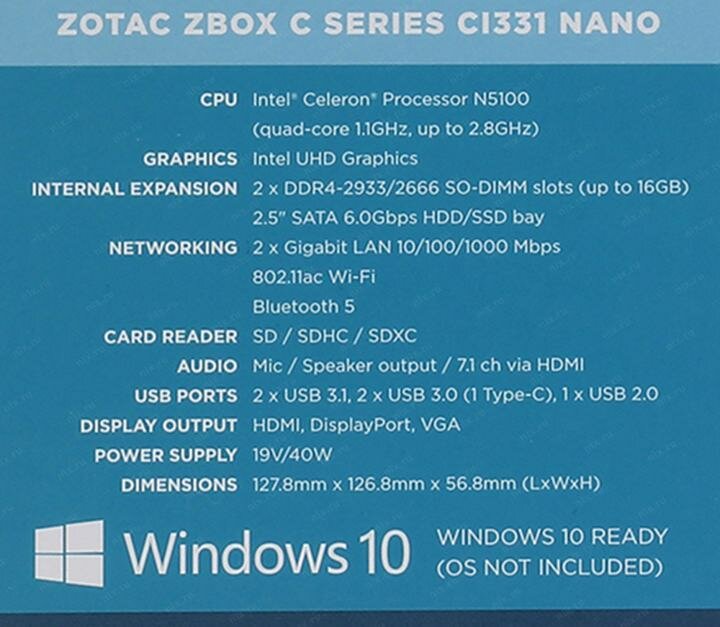 Компьютер Zotac ZBOX-CI331NANO-BE (Intel Celeron N5100, 1.1 GHz - 2.8 GHz, No Ram 2x DDR4 SODIMM, No HDD 1x 2.5", DVD нет, Intel UHD Graphics, No OS, черный, ZBOX-CI331NANO-BE)