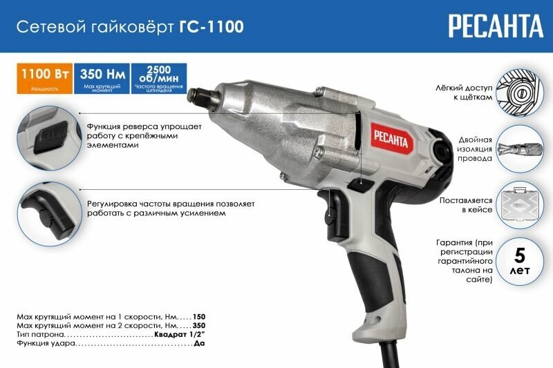 Ударный гайковерт Ресанта ГС-1100, 1100 Вт, 350 Нм, 2500 об/мин, в кейсе, 75/24/1