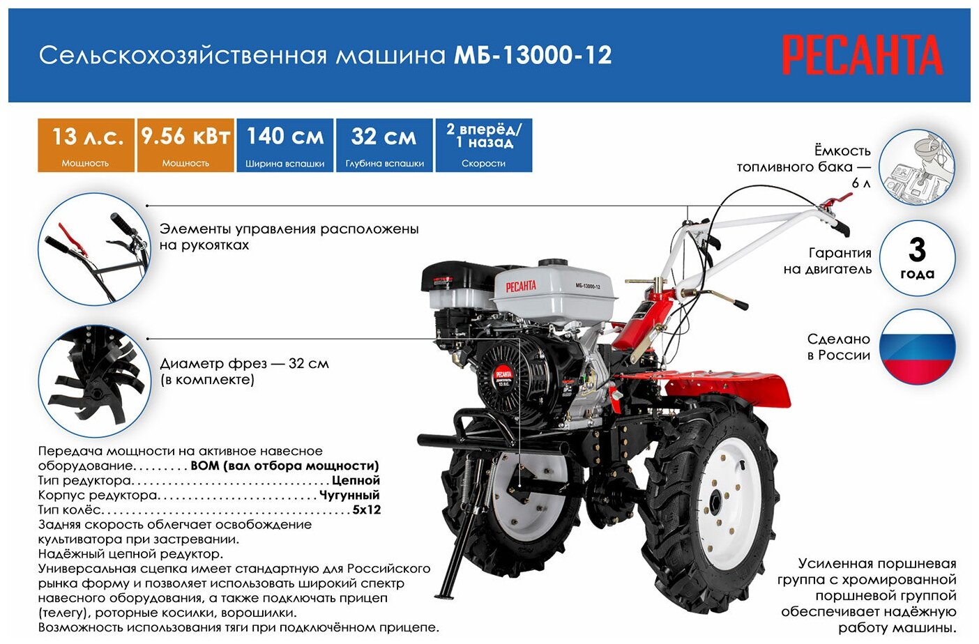 Мотоблок / Сельскохозяйственная машина Ресанта МБ-13000-12 (13 л.с., четырехтактный, бензин, бак – 6 л, ширина – 140 см)
