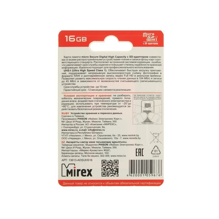 Карта памяти Mirex microSD, 16 Гб, SDHC, UHS-I, класс 10, с адаптером SD(В наборе1шт.) интересное: