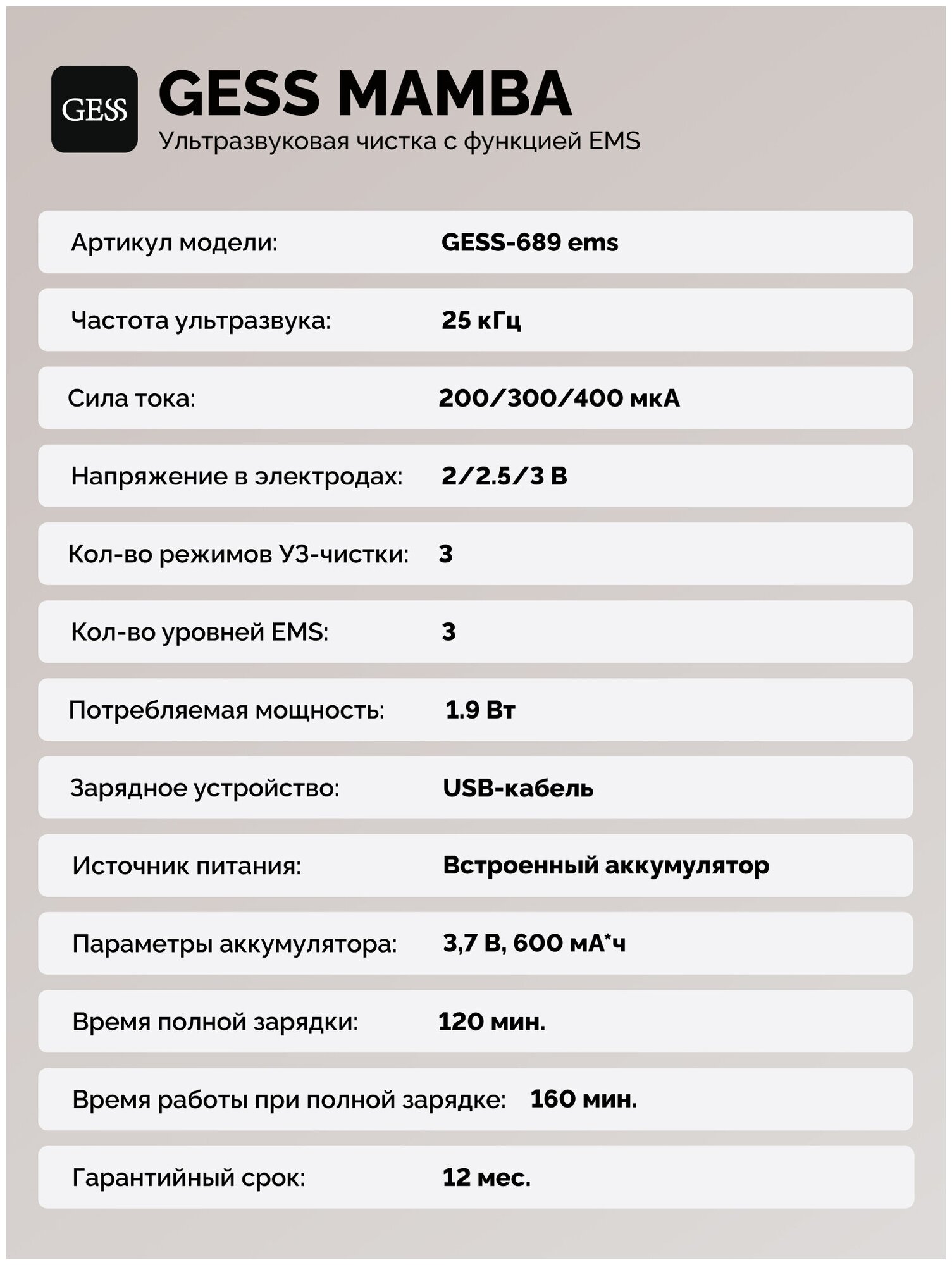 Аппарат для ультразвуковой чистки лица GESS MAMBA, микротоки для лица, многофункциональный массажер с EMS электростимуляцией интересное:
