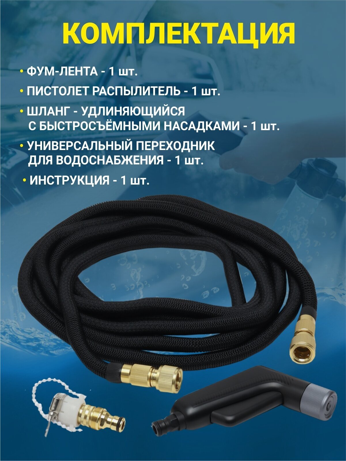 | Комплектация | Шланг для полива, быстросъемники, переходник |