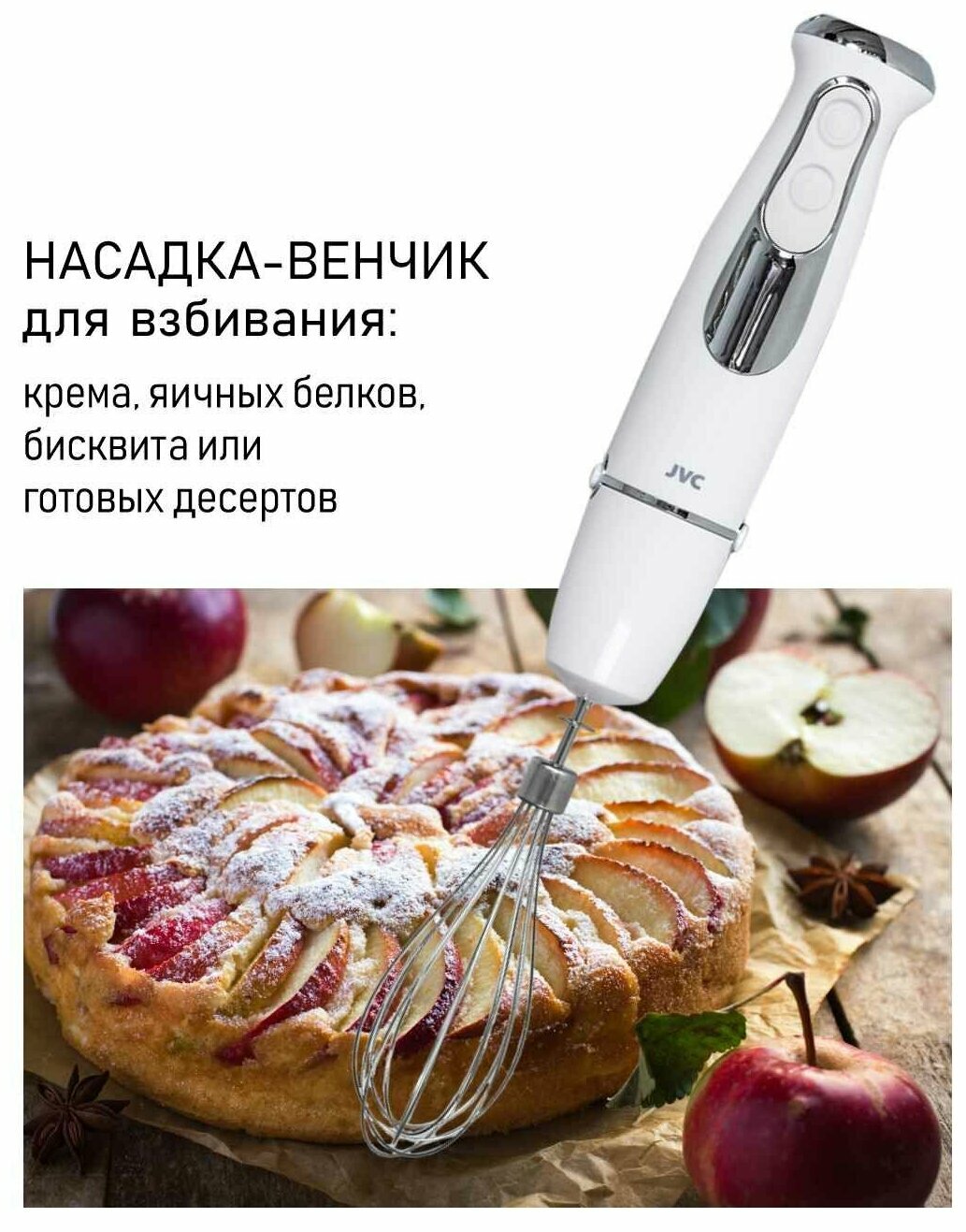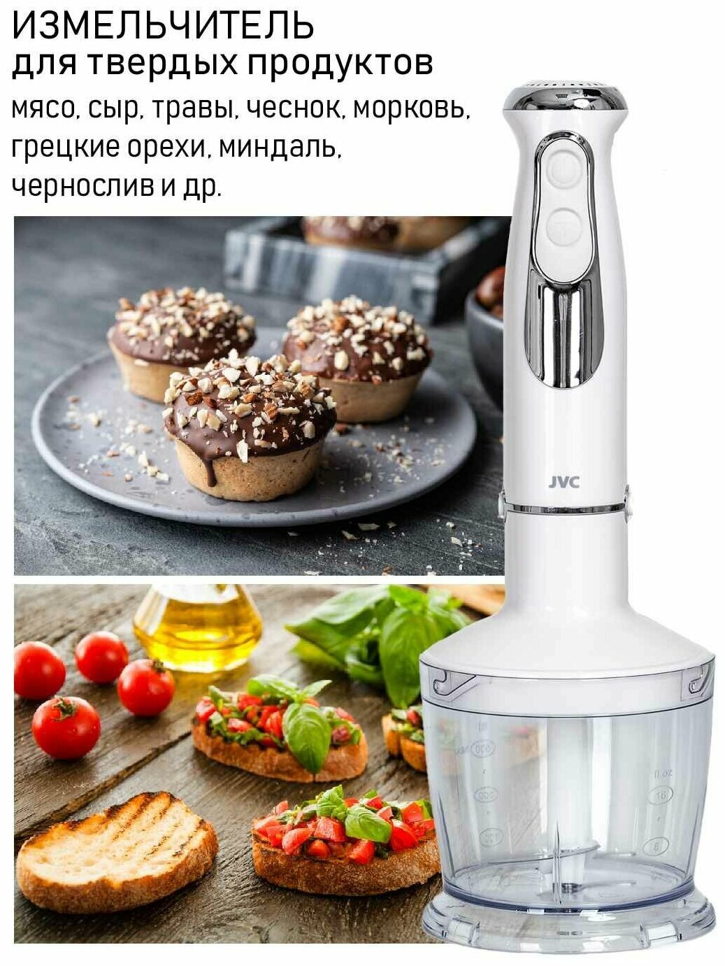 Блендер погружной JVC с измельчителем, 3 насадки, 2 скорости, 5 уровней мощности, режим Турбо, специальное покрытие Ivory white, 1200 Вт