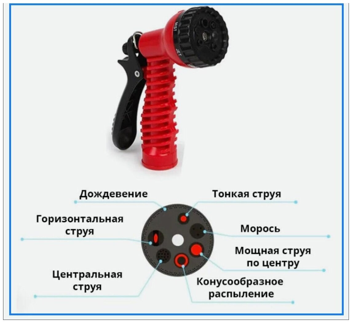 | Комплектация | Шланг поливочный растягивающийся 50 метров, распылитель 7 режимов полива |