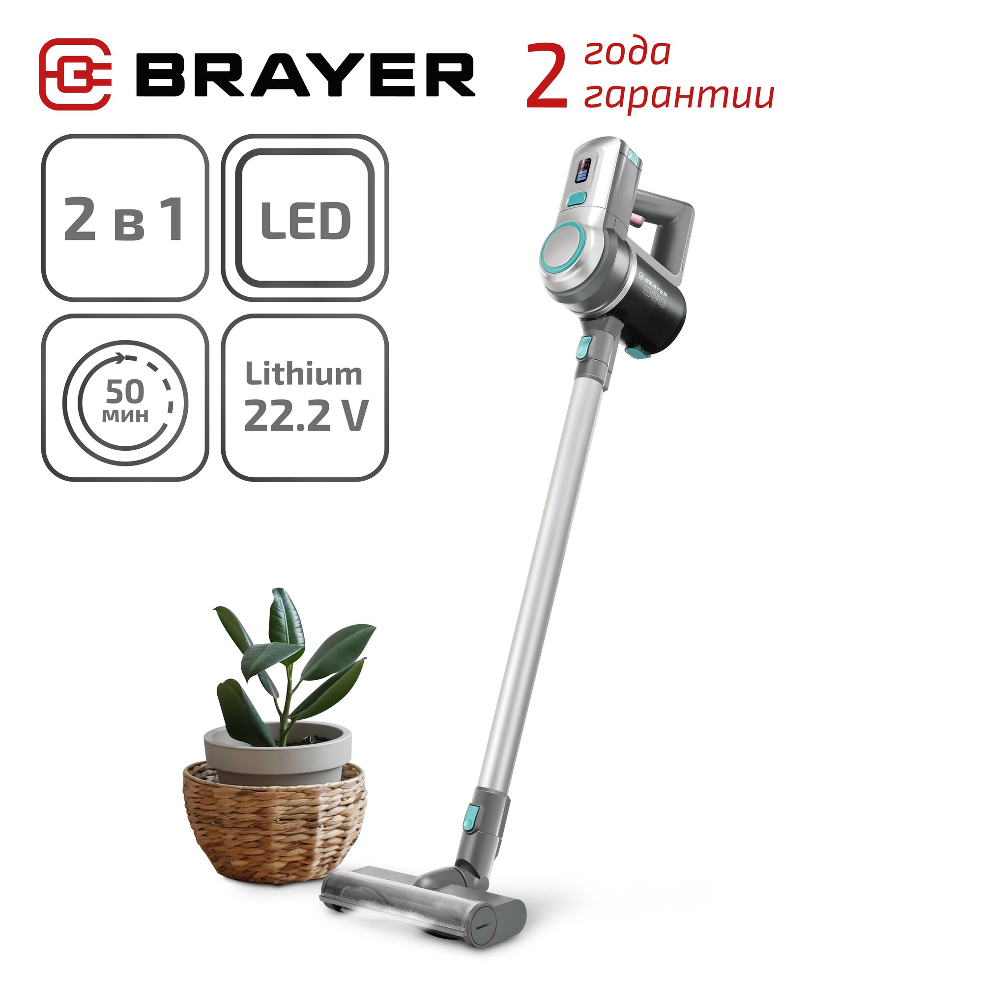 Вертикальный пылесос BRAYER BR4262, 2в1, 200Вт, BLDC мотор, контейнер 1л, батарея 22.2 В, Li-Ion 2200 мА/ч, турбощетка с LED, база д/хранения