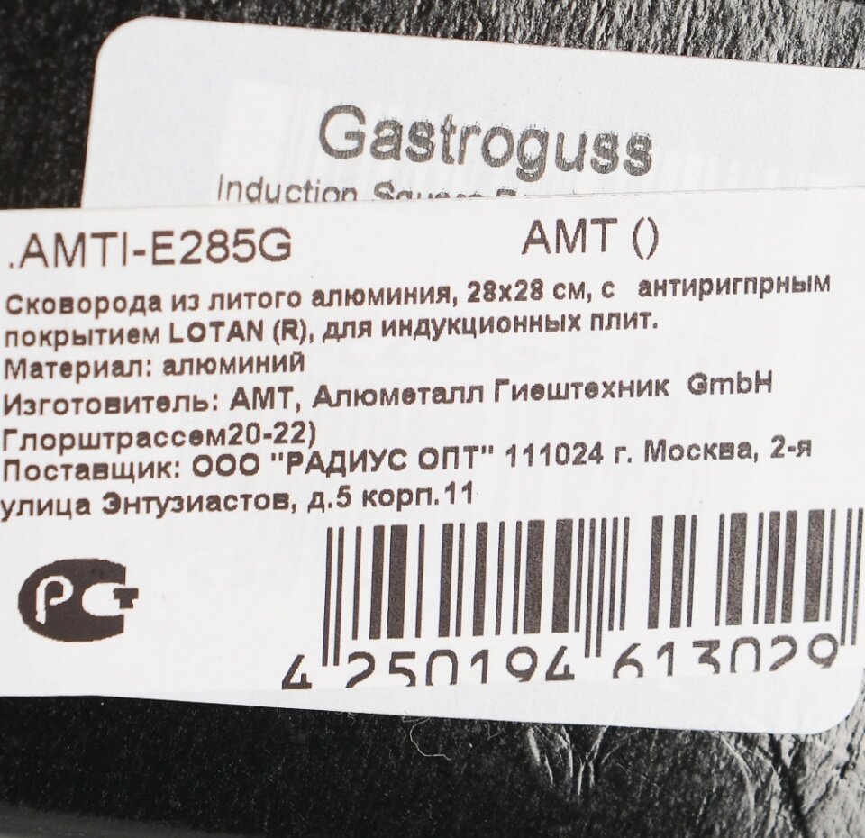 Сковорода-гриль AMT GASTROGUSS Diamond Induction 28 см, AMT I-E285G, литой алюминий, антипригарное покрытие, съемные ручки, индукционная, квадратная, черная, Германия