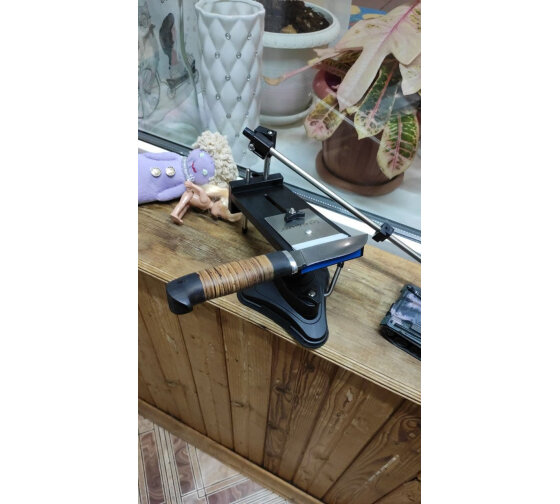 1 это крепление станка к столу, пресловутая присоска, которая должна гарантировать лекцию фиксацию и предотвращает скольжение прибора по поверхности нихрена не держит от слова совсем. 2 крепление клинка, возможно, я не отрицаю что я рукожоп! Но по логике вещей клинок должен зажиматься прижимной пластиной и жёстко фиксироваться, а вот нихрена, как не старайся его зажать он наровит уйти в бок при работе, узкий клинок вообще зажать там не реально, не будет достаточно пространства для соблюдения угла заточки |