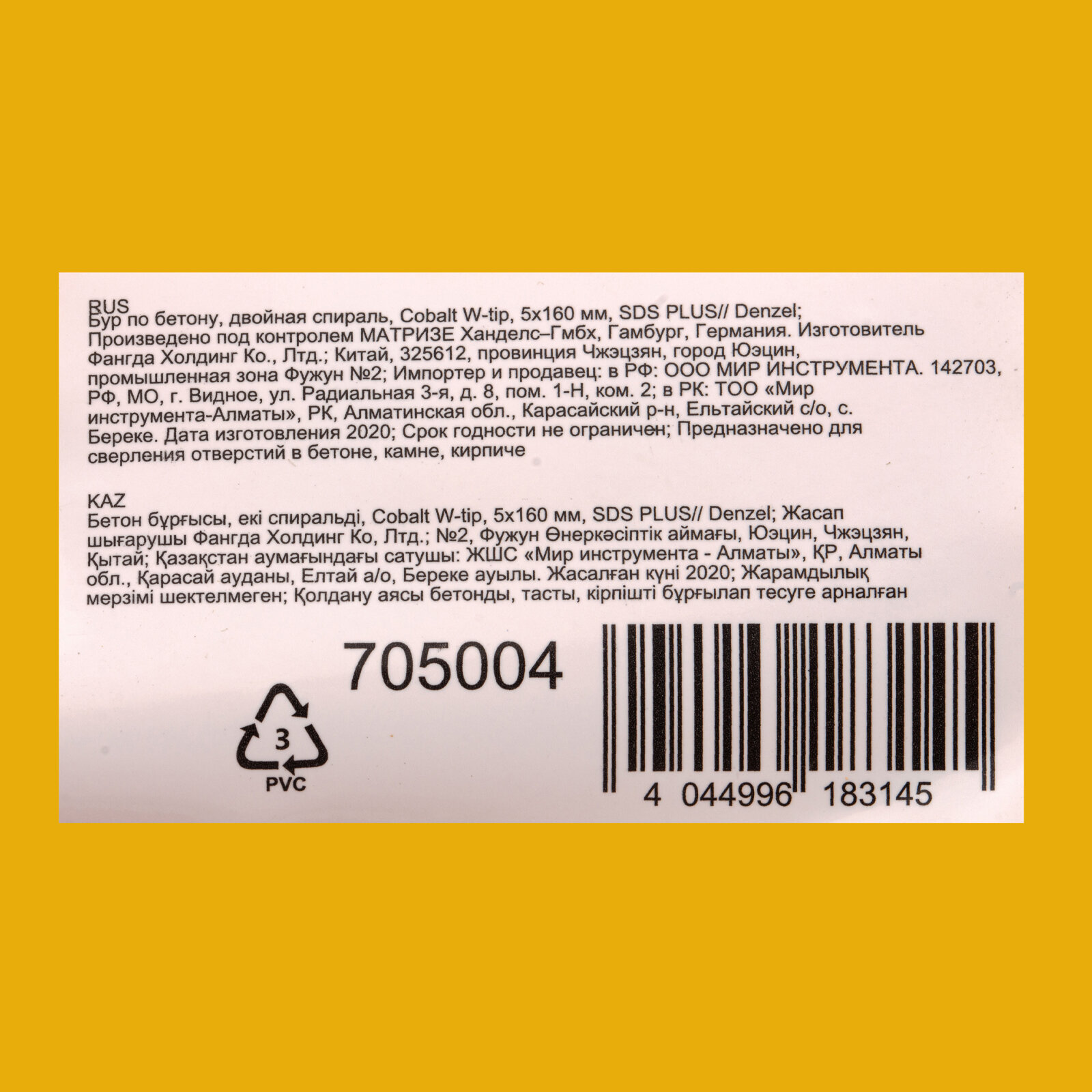 Бур по бетону, двойная спираль, Cobalt W-tip, 5x160 мм, SDS PLUS, DENZEL 705004