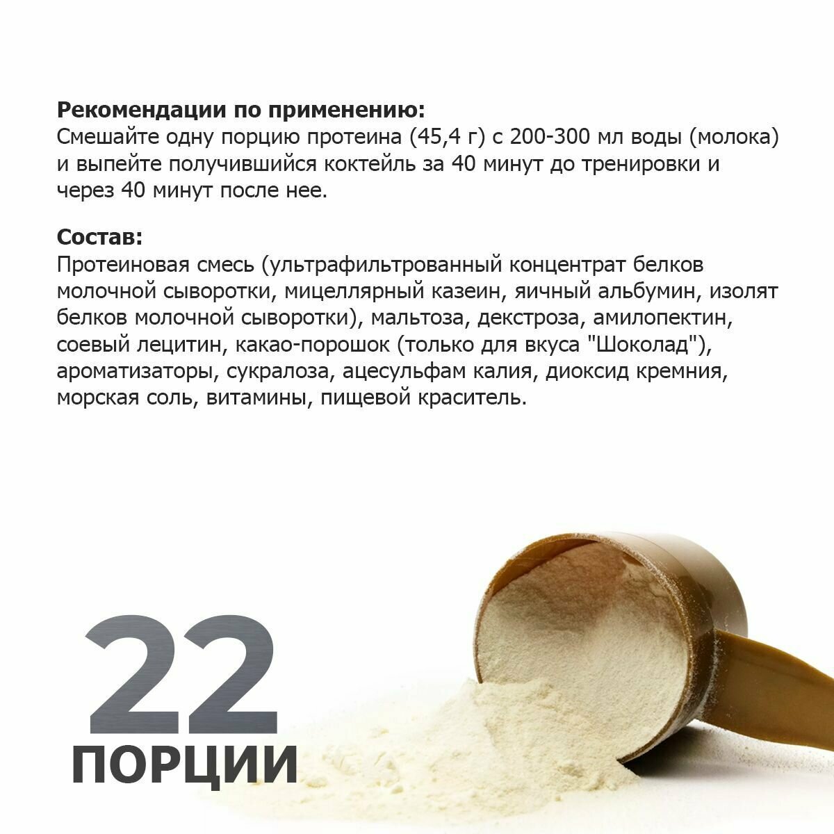 | Тип | казеин / многокомпонентный / молочный / соевый / сывороточный гидролизат / сывороточный изолят / сывороточный концентрат / яичный |