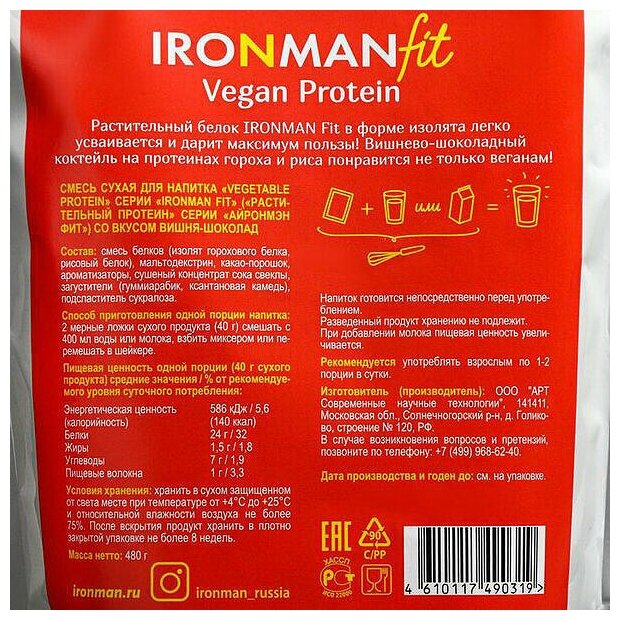 Растительный протеин Ironman, 480г (Шоколад-вишня) / Веганский белок / Гороховый, рисовый интересное: