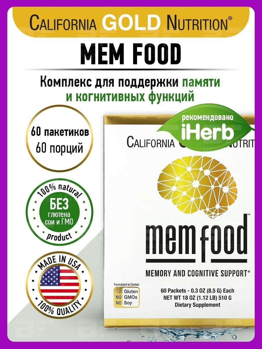 California Gold Nutrition, MEM Food, добавка для поддержки памяти и когнитивных функций со смесью MEM, L-серином, органическим ежовиком гребенчатым и порошком из сока голубики, 60 пакетиков по 8,5 г (0,3 унции)