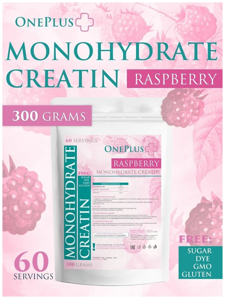 Купить One Plus Креатин моногидрат порошок со вкусом Малина 300г