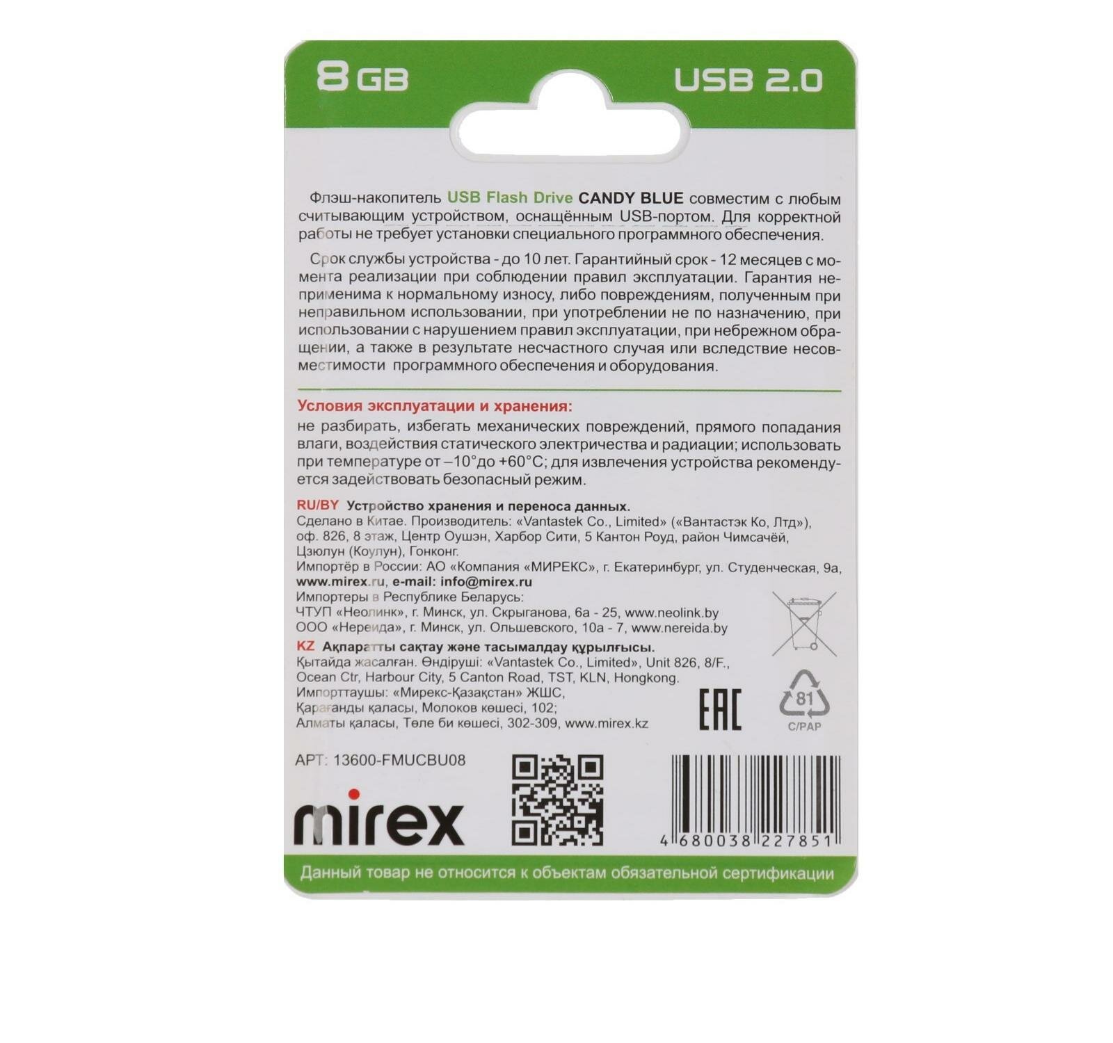 Флешка Mirex Candy Blue, 8 Гб ,usb2.0, чт до 25 Мб/с, зап до 15 Мб/с, синяя Mirex 9284242 интересное: