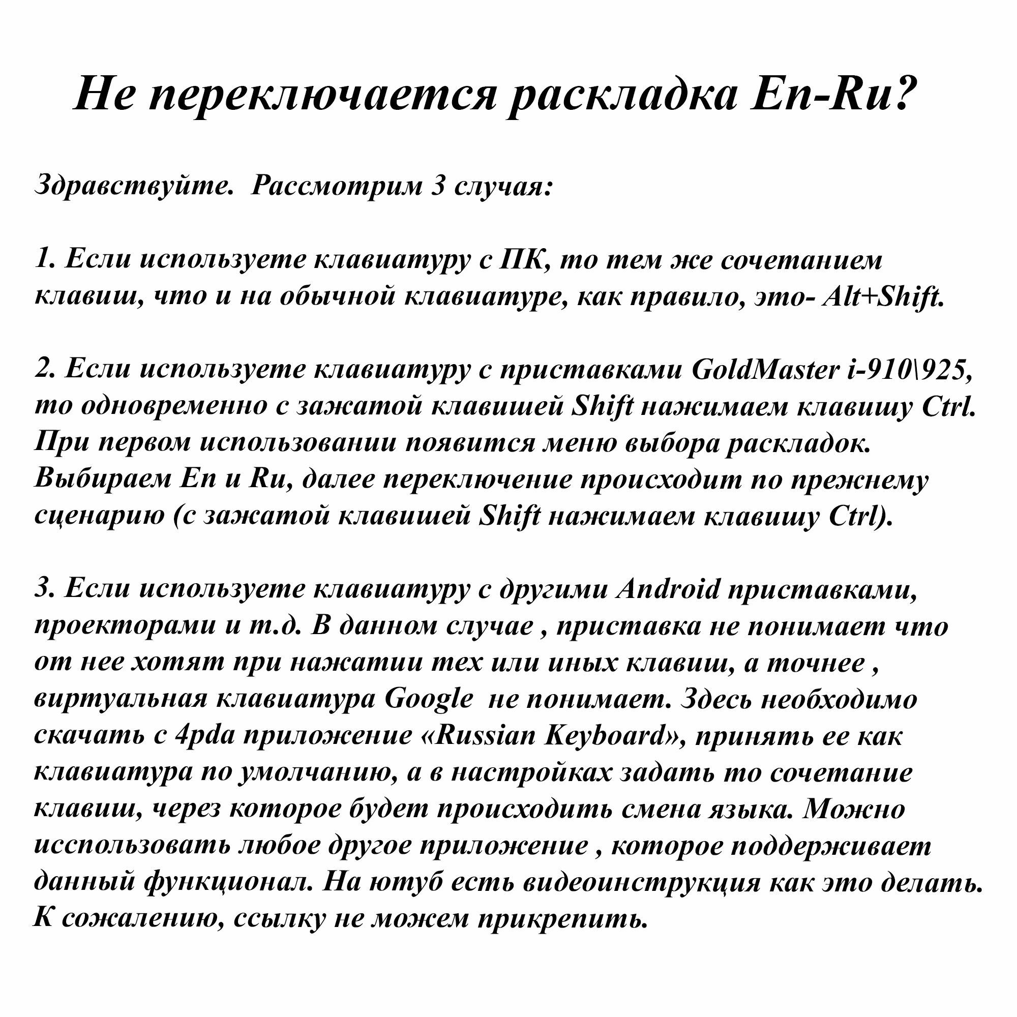 Для использования русской раскладки (русские буквы на клавиатуре есть) поставщик в разделе "Вопросы" советует установить дополнительную программу на устройство (в моем случае это устройство Android TV) - External keyboard helper или Russian keyboard. Первая в Google Play Market продается только за деньги (хотя в описании написано про бесплатную демо версию, я ее не нашел), вторая - отсутствует. В итоге нашел и скачал в Интернете файл apk для Russian keyboard, установил на устройство через USB флэшку, после этого русская клавиатура заработала.