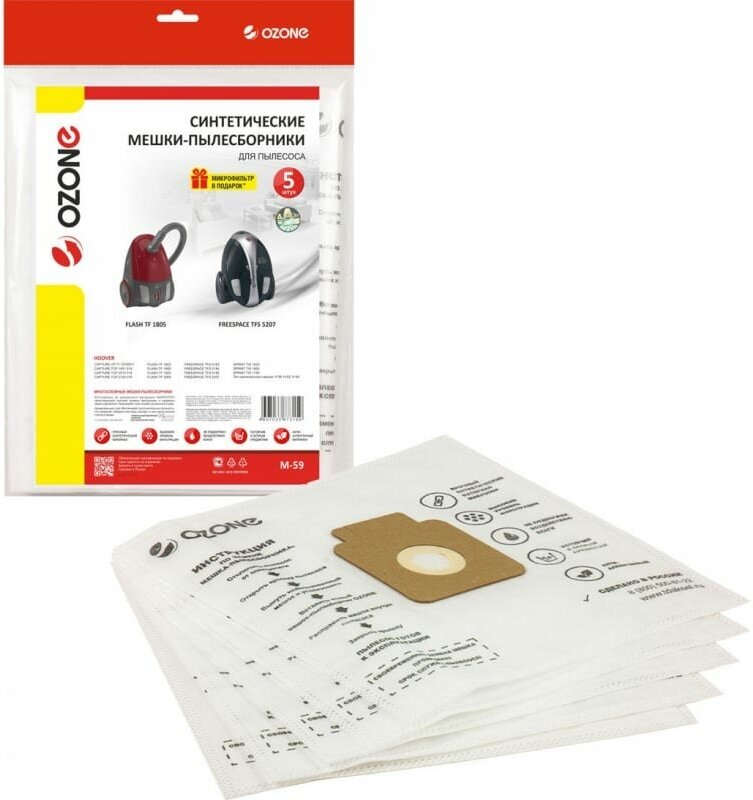Ozone M-59 Мешки для пылесоса HOOVER одноразовые 5 шт., синтетические, многослойные + микрофильтр / пылесборник