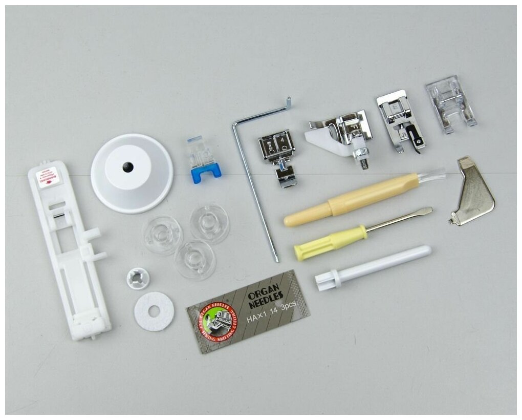 | Подробная комплектация | 1. Швейная машина 2. Лапка универсальная 3. Лапка для автоматического выметывания петли 4. Лапка для вшивания молнии 5. Лапка для пришивания пуговицы 6. Оверлочная лапка 7. Лапка для невидимой подгибки регулируемая 8. Лапка для декоративных строчек 9. Направляющая для выстегивания 10. Запасные иглы и шпульки 11. Жесткий чехол 12. Педаль 13. Инструкция + DVD |