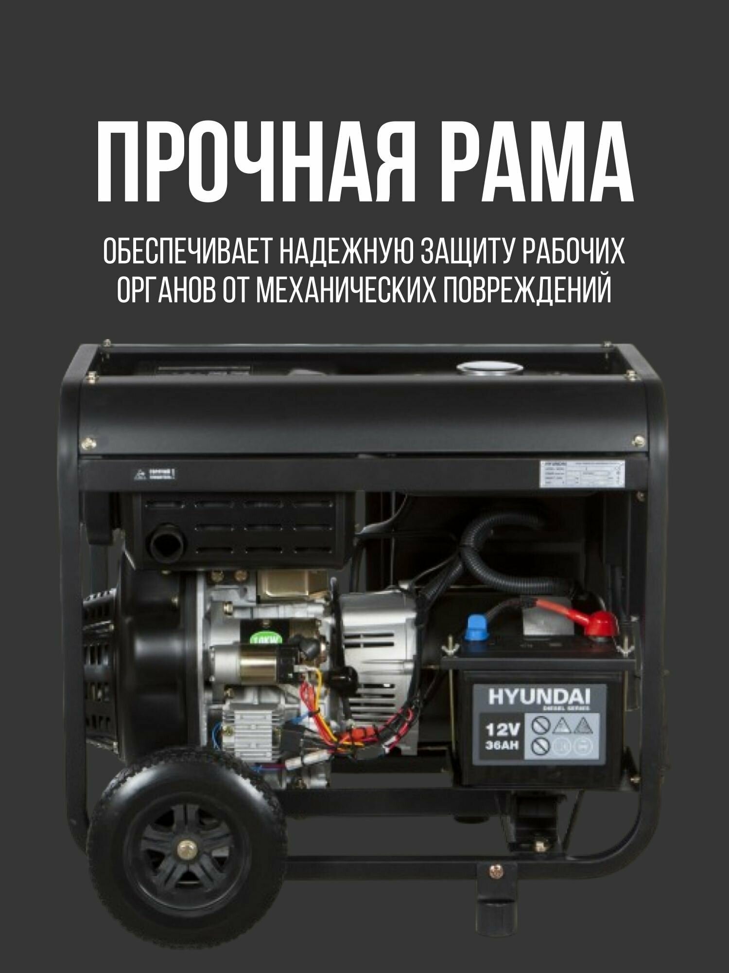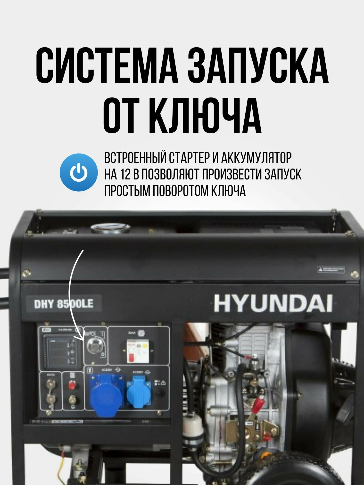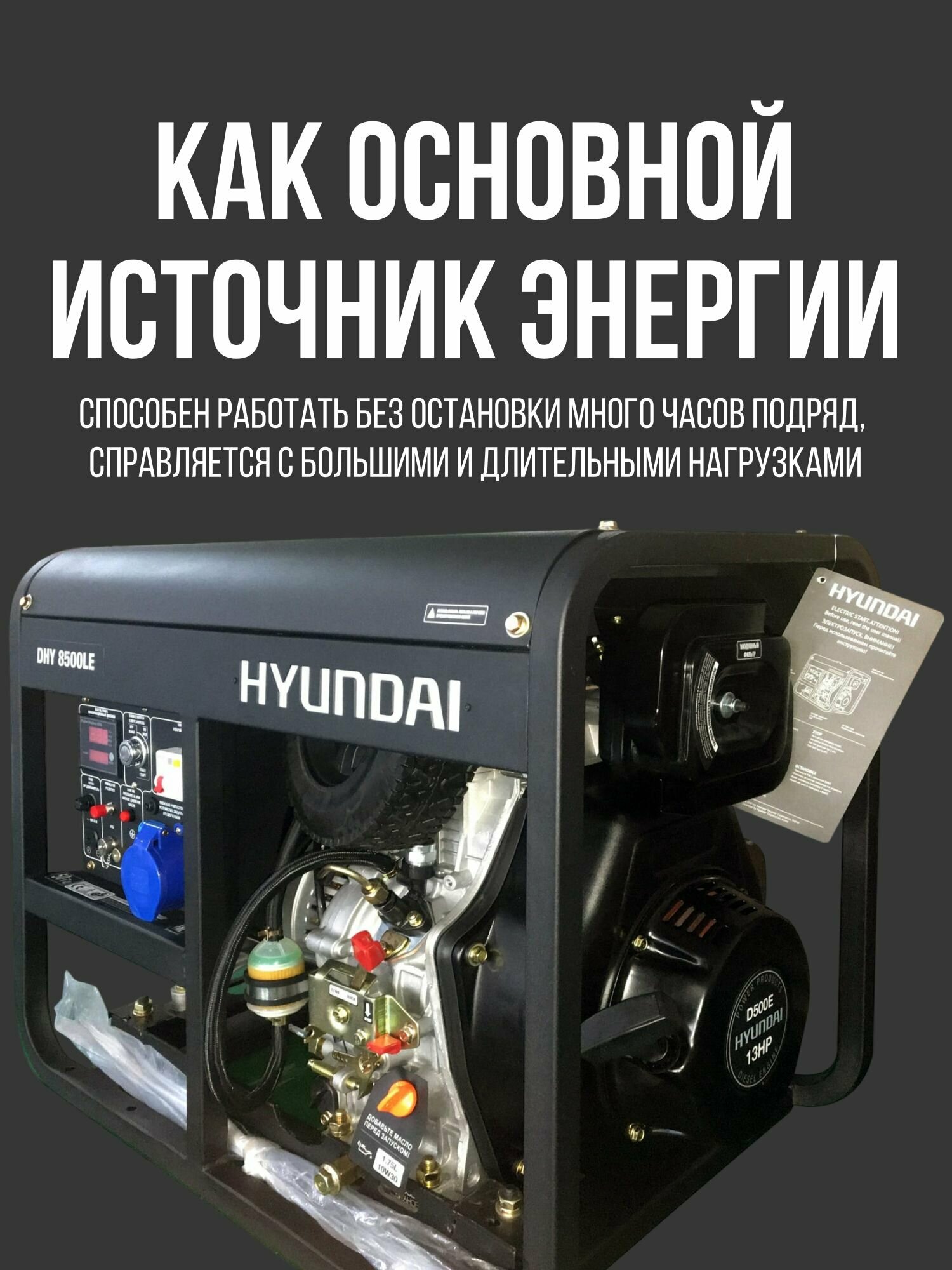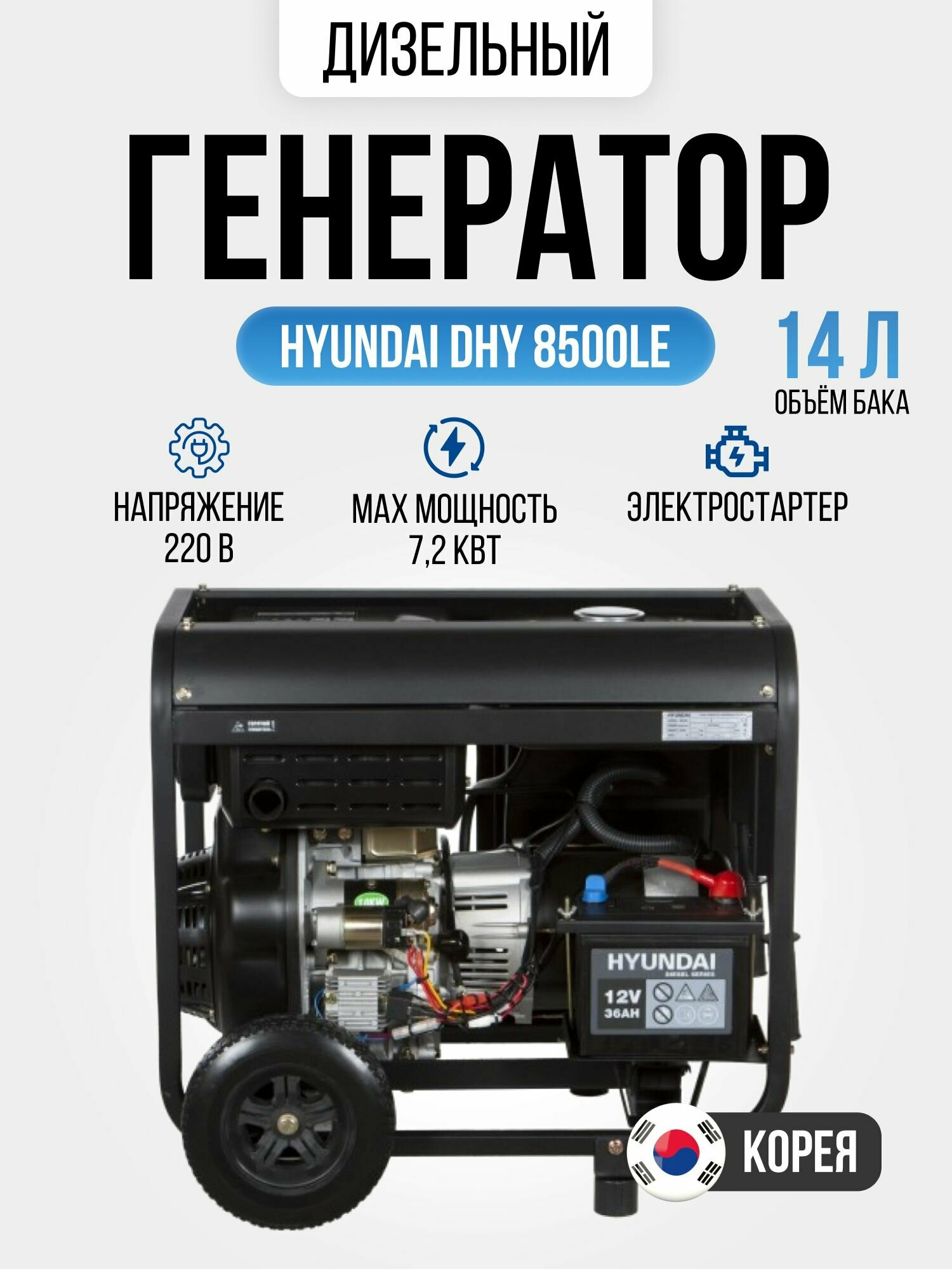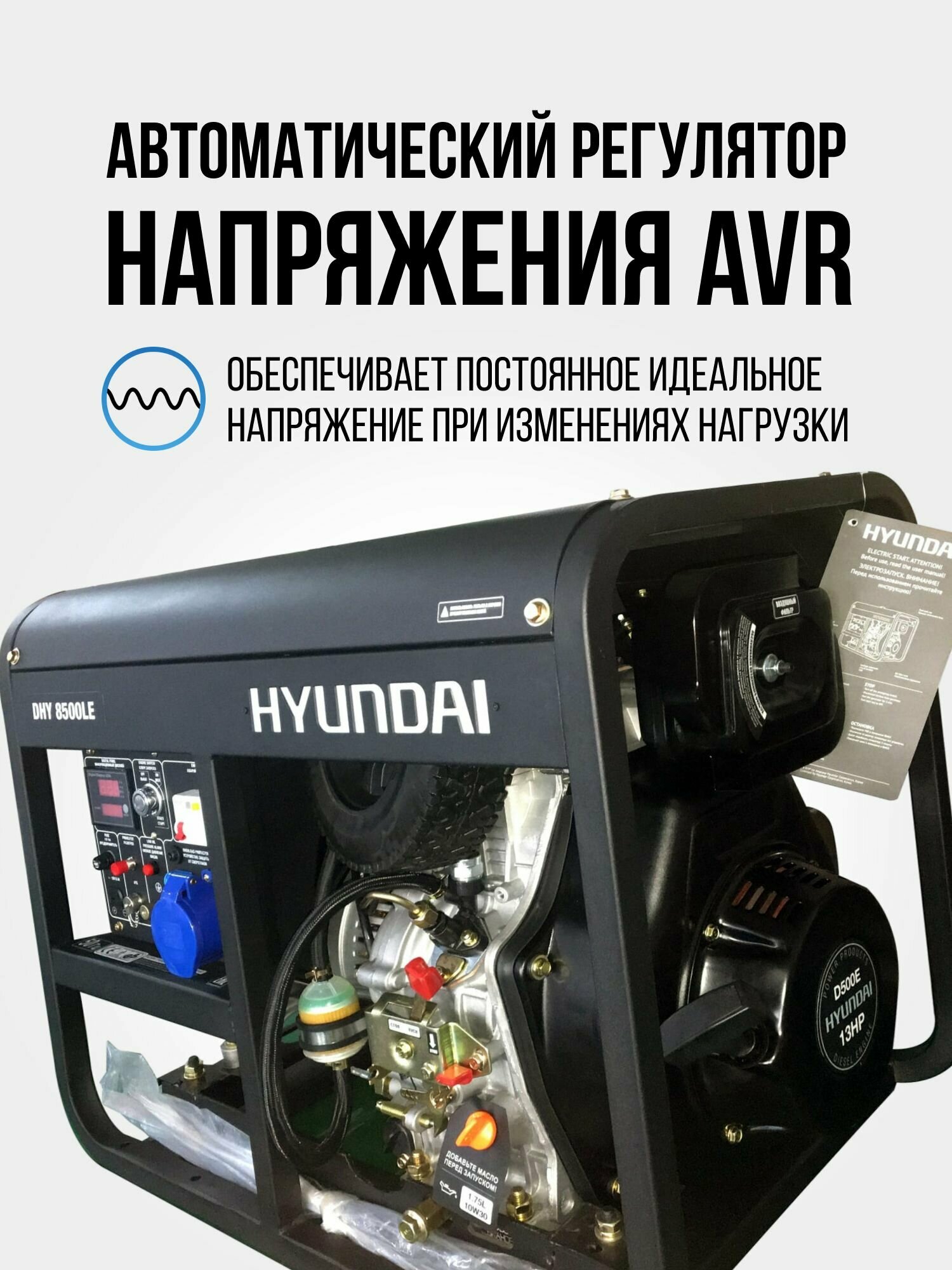 Дизельный генератор Hyundai DHY 8500 LE 7,2 кВт, электрогенератор с ручным и электрозапуском двигателя и автоматическим регулятором напряжения 116кг