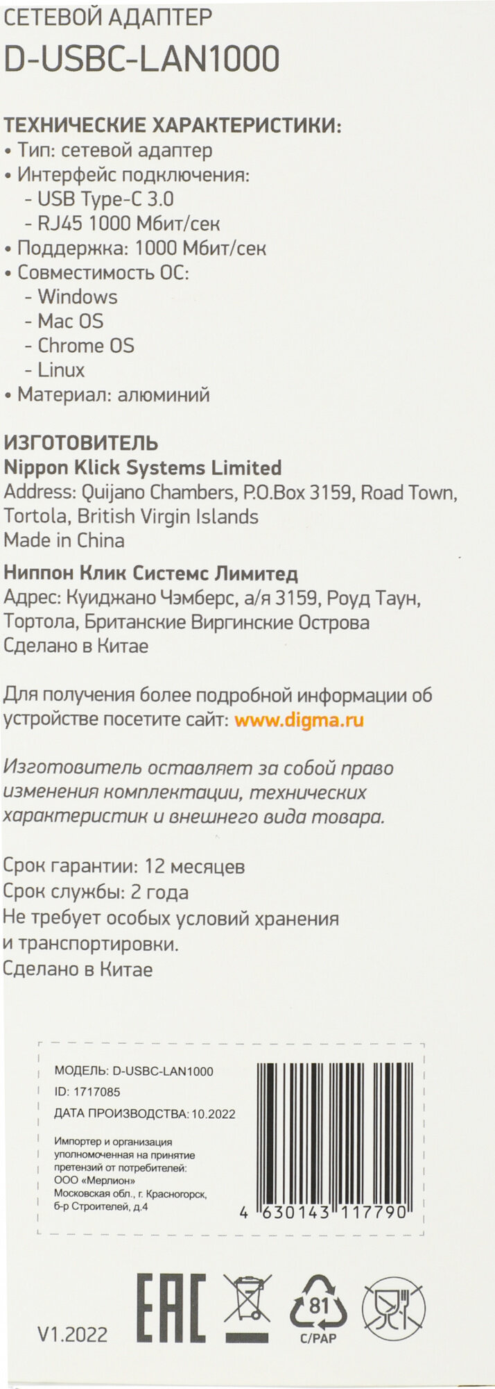 Сетевой адаптер Gigabit Ethernet Digma D-USBC-LAN1000 USB Type-C (упак.:1шт) интересное: