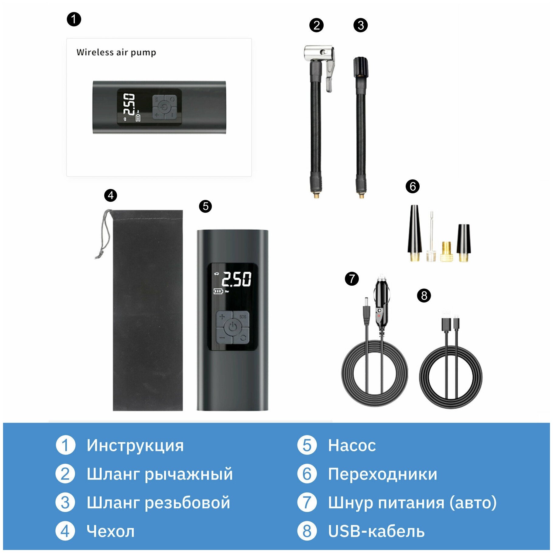 В комплекте провод зарядки от авто и от розетки. Два шланга для накачки, один быстрый Хашим второй для накручивания на ниппель. Мячики и велик накачал супер быстро. Фонарик в зоне накачки удобен светит и все видно