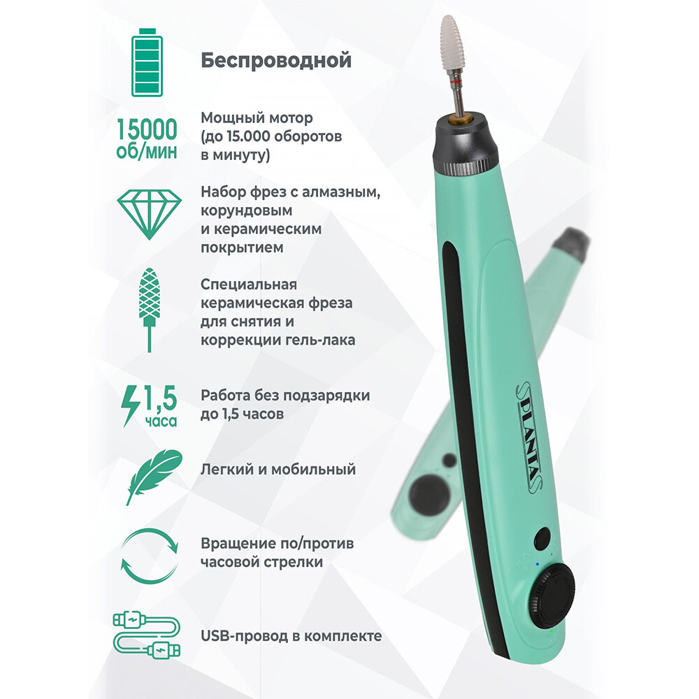 PLANTA Беспроводной аппарат для аппаратного маникюра и педикюра PL-MAN20, машинка для снятия и коррекции гель лака, до 15 000 об/мин, в комплекте 7 насадок интересное:
