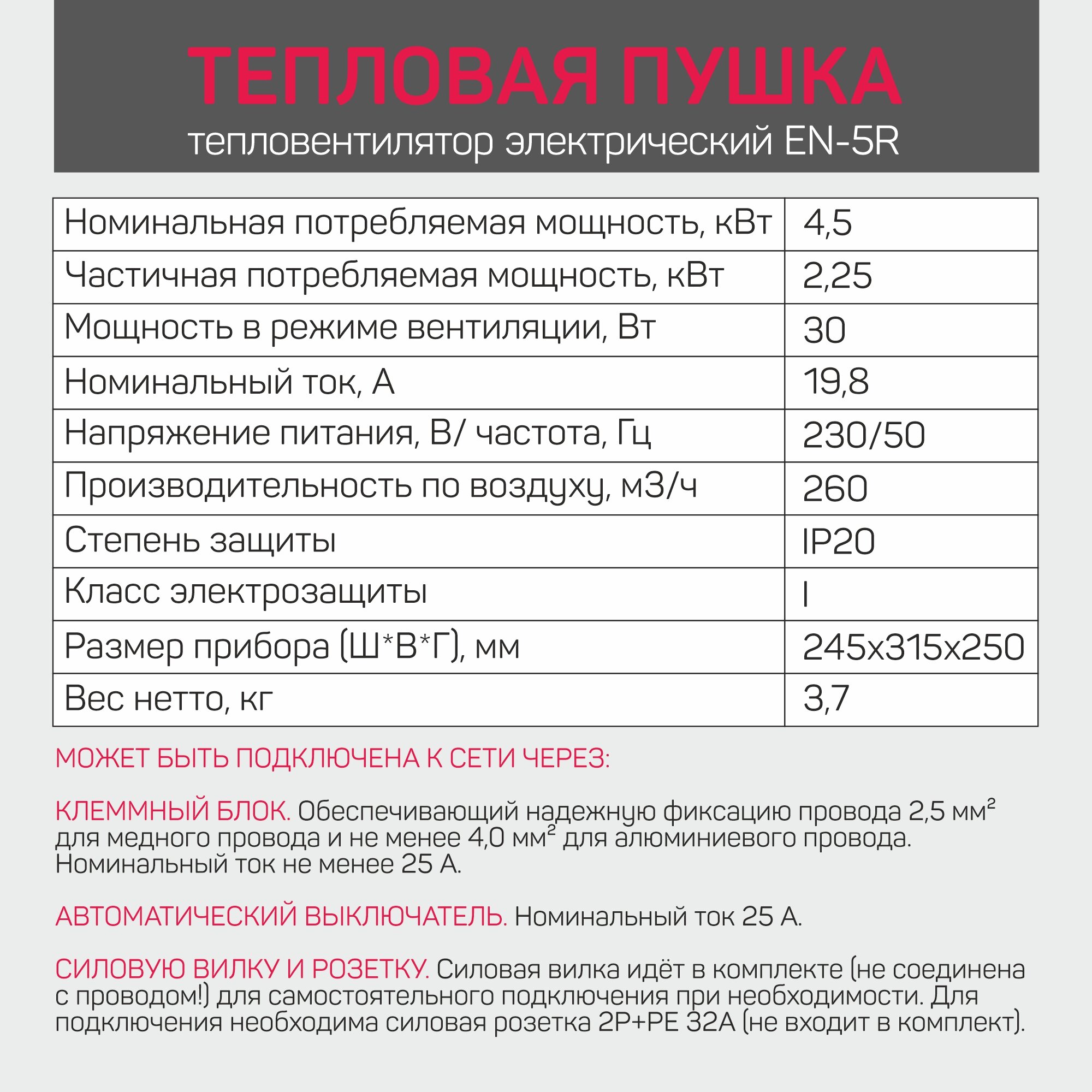 | Потребляемая мощность | 4500 Вт |