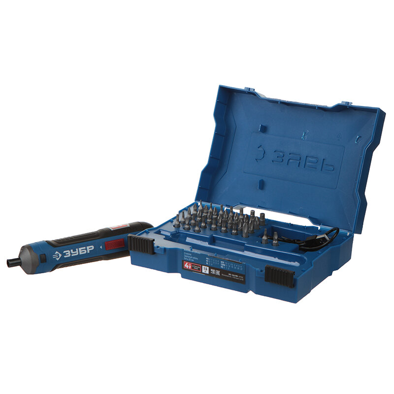 ЗУБР в кейсе с набором 33 бит, отвертка аккумуляторная PSD-4S Профессионал