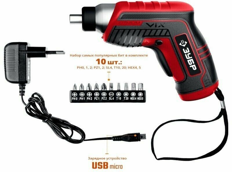 ЗУБР ViX 3.6 В, аккумуляторная отвертка, 10 бит (ЗО-Е-3.6 Ли)