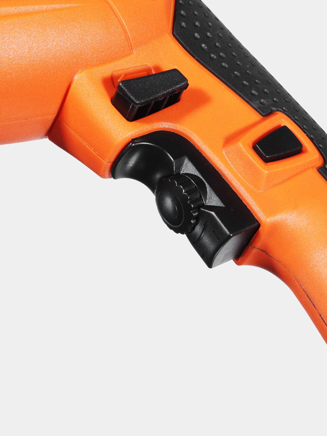 регулируется скорость. Кнопки нажимаются легко. Охлаждение редуктора работает отлично не греется. Есть дополнительная рукоять, удобнее держать. Провод только короткий, а так ништяк дрель. |