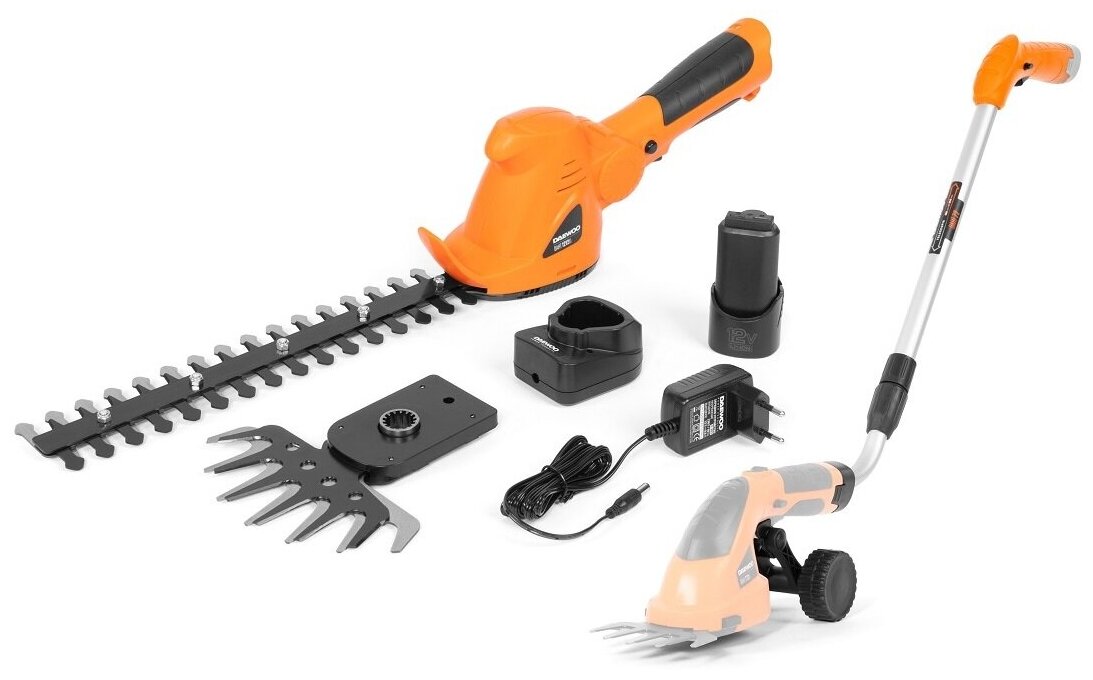 | Комплектация | Ножницы-кусторез, насадка кусторез, насадка ножницы, АКБ, ЗУ, телескопическая штанга, инструкция, гарантийный талон. |
