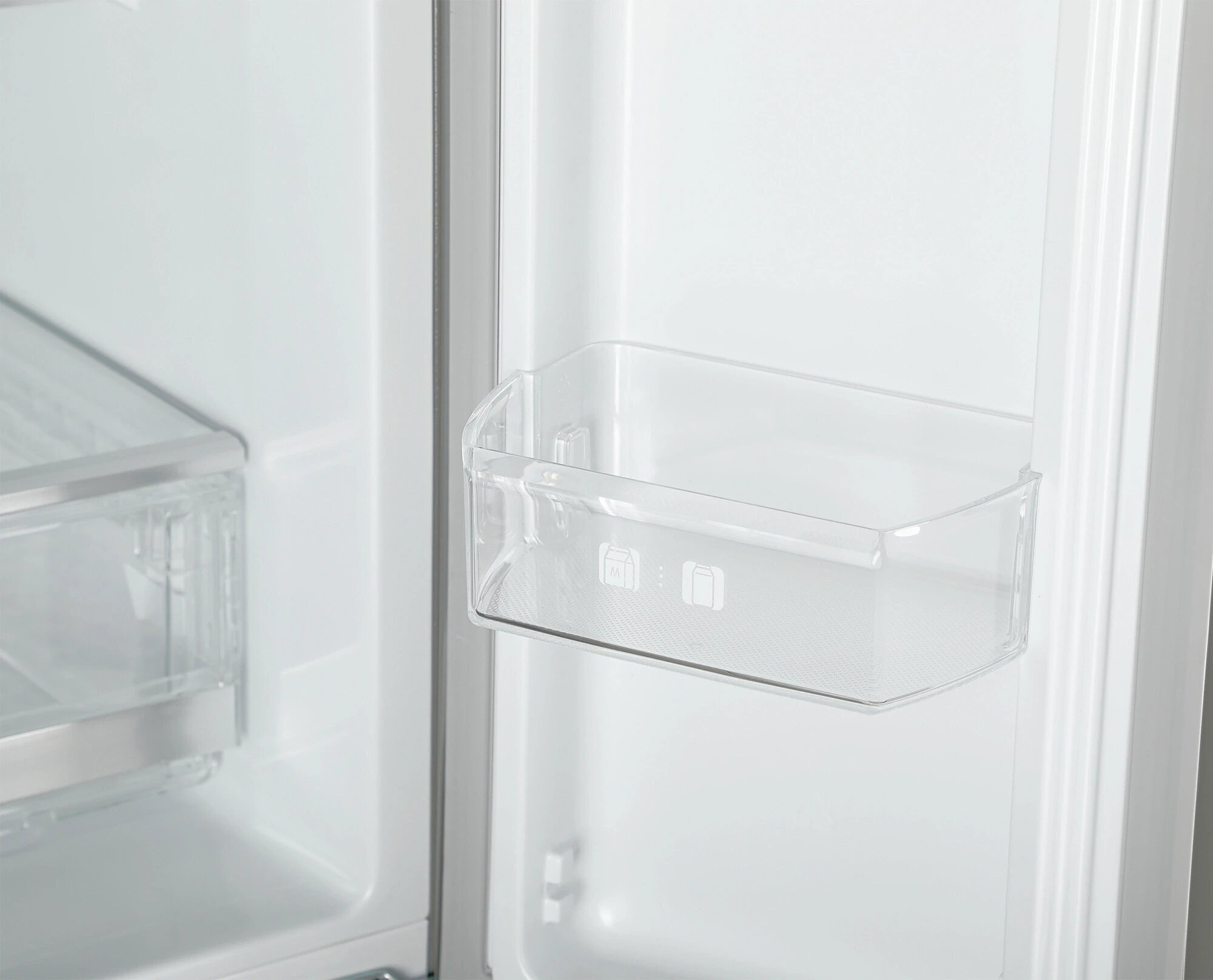 б) Серебристый цвет выглядит стильно. в) Удобная конструкция с распашными дверями и выдвижными полками морозилки. |