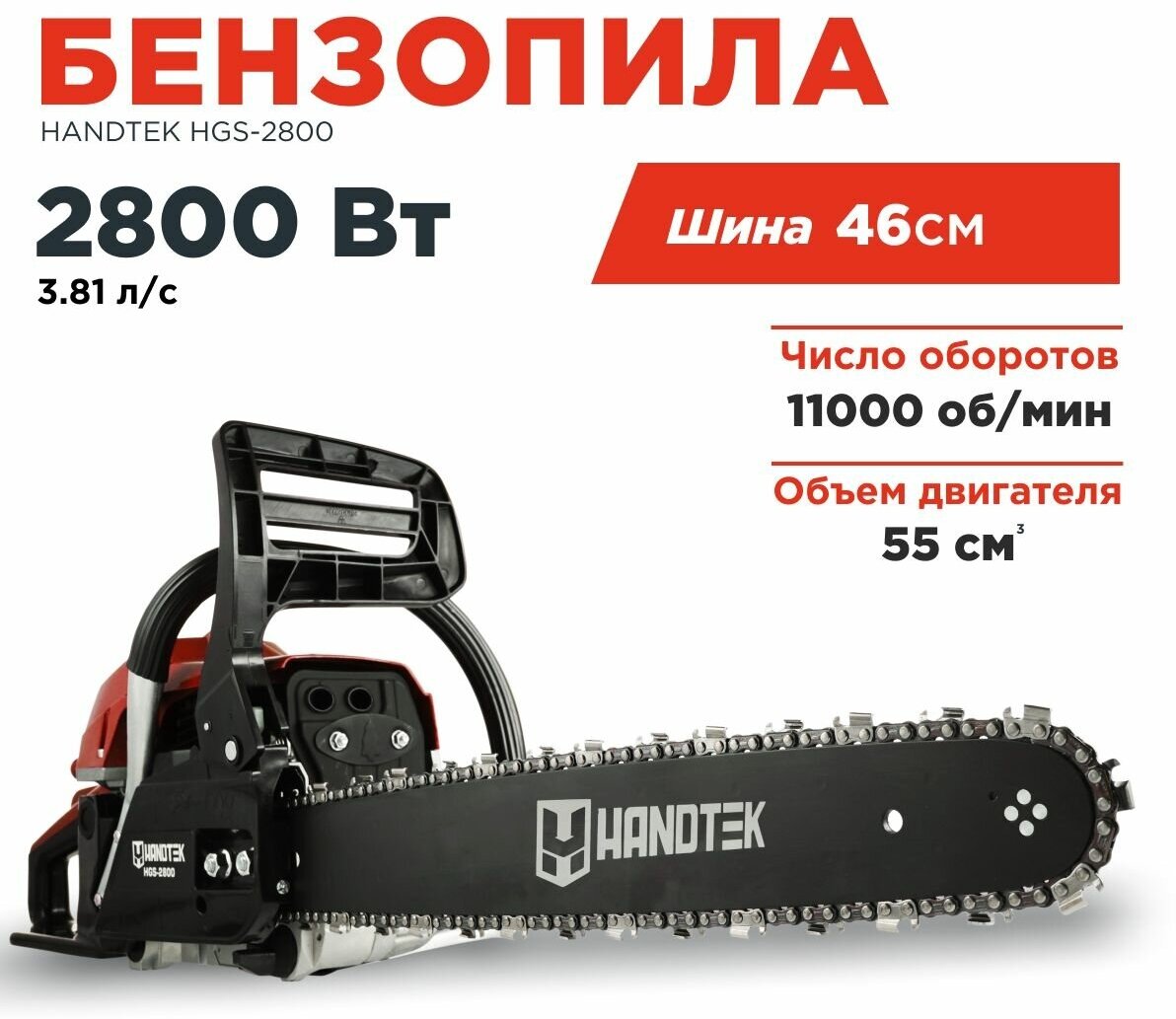 Купить Бензопила цепная пила Handtek HGS-2800 красная, 2800 Вт 3.81 л.с, 11000 об/мин, 72 звена/ двухтактный двигатель, шина 46см, зубчатый упор