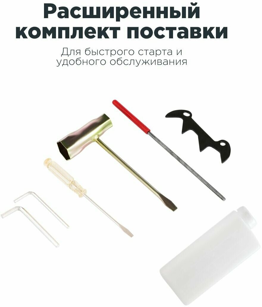 | Комплект поставки | Бензопила - 1 шт, Шина - 1 шт, Цепь - 1 шт, Кожух шины - 1 шт, Ремкомплект - 1 шт, Напильник для цепи - 1 шт, бутылка для топлива - 1 шт, |