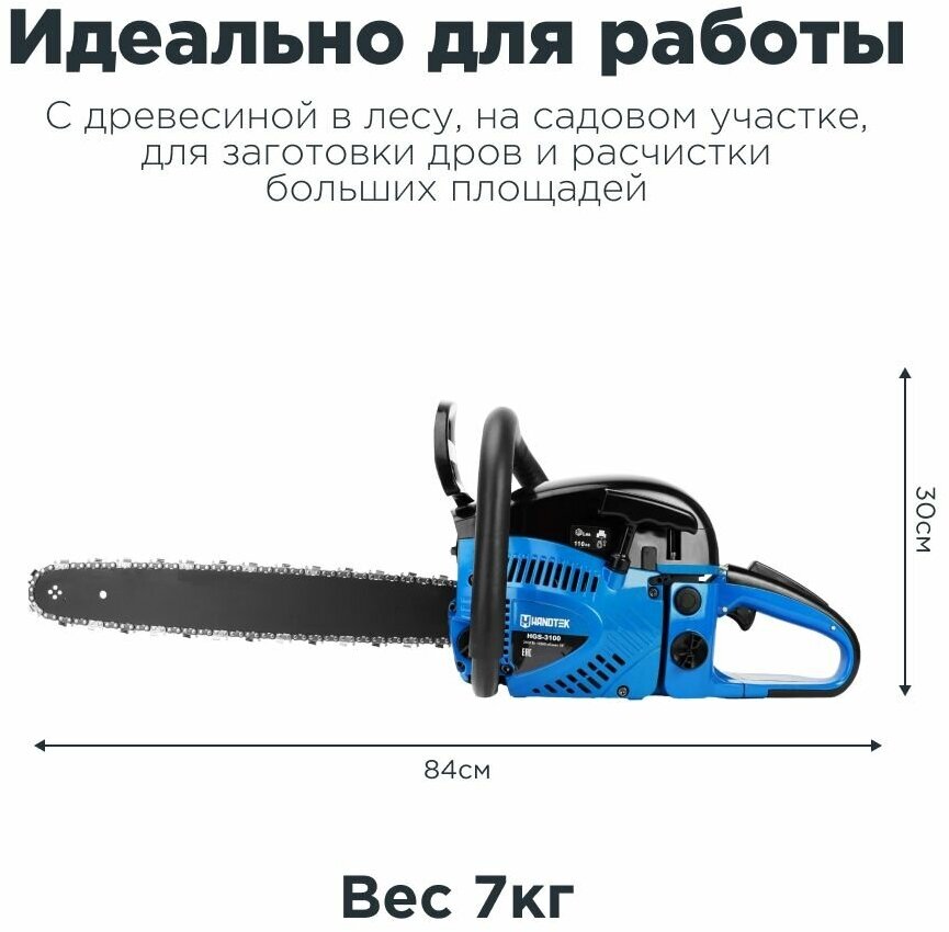 Бензопила цепная пила Handtek HGS-3100, 3100 Вт 3.81 л.с, 12500 об/мин, 72 звена/ двухтактный двигатель, шина 46см, зубчатый упор металлический кейс интересное:
