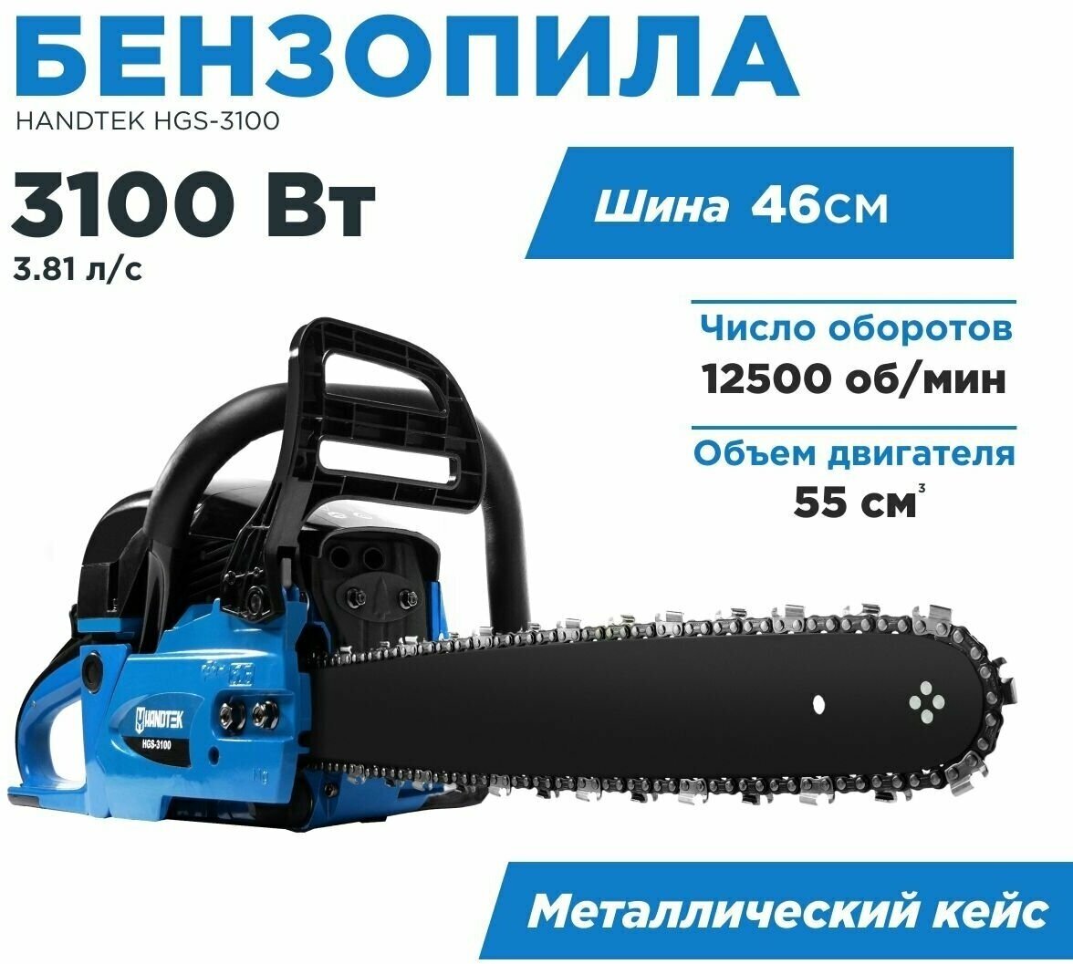 Купить Бензопила цепная пила Handtek HGS-3100, 3100 Вт 3.81 л.с, 12500 об/мин, 72 звена/ двухтактный двигатель, шина 46см, зубчатый упор металлический кейс