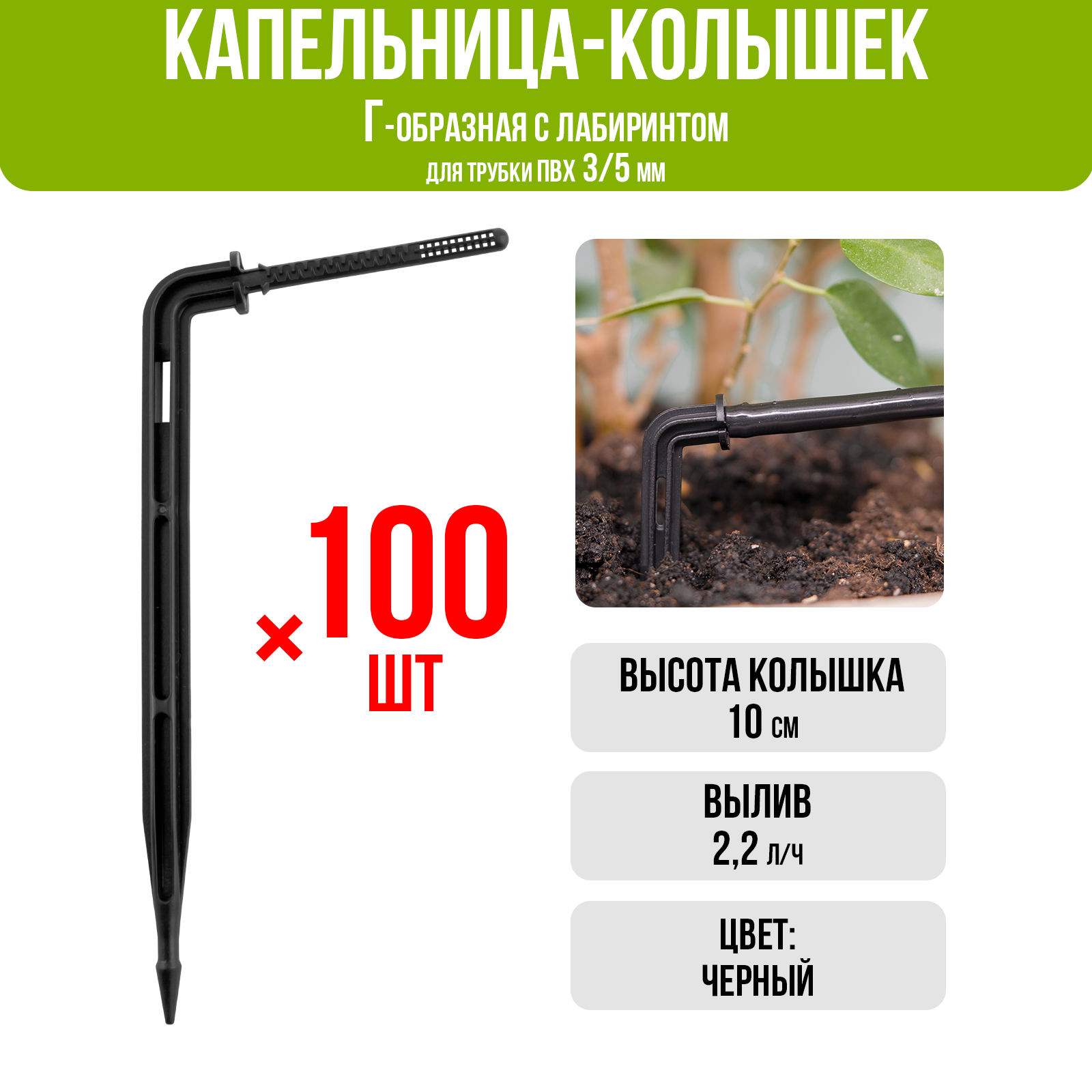Капельница Г-образная с лабиринтом, 10см, 2л/ч, чёрная (подключается к трубке ПВХ 3/5мм). Упаковка 100шт.