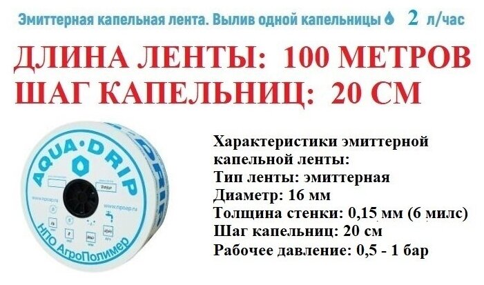 | Комплектация | Лента для капельного полива эмиттерная 100 метров, упаковка. |