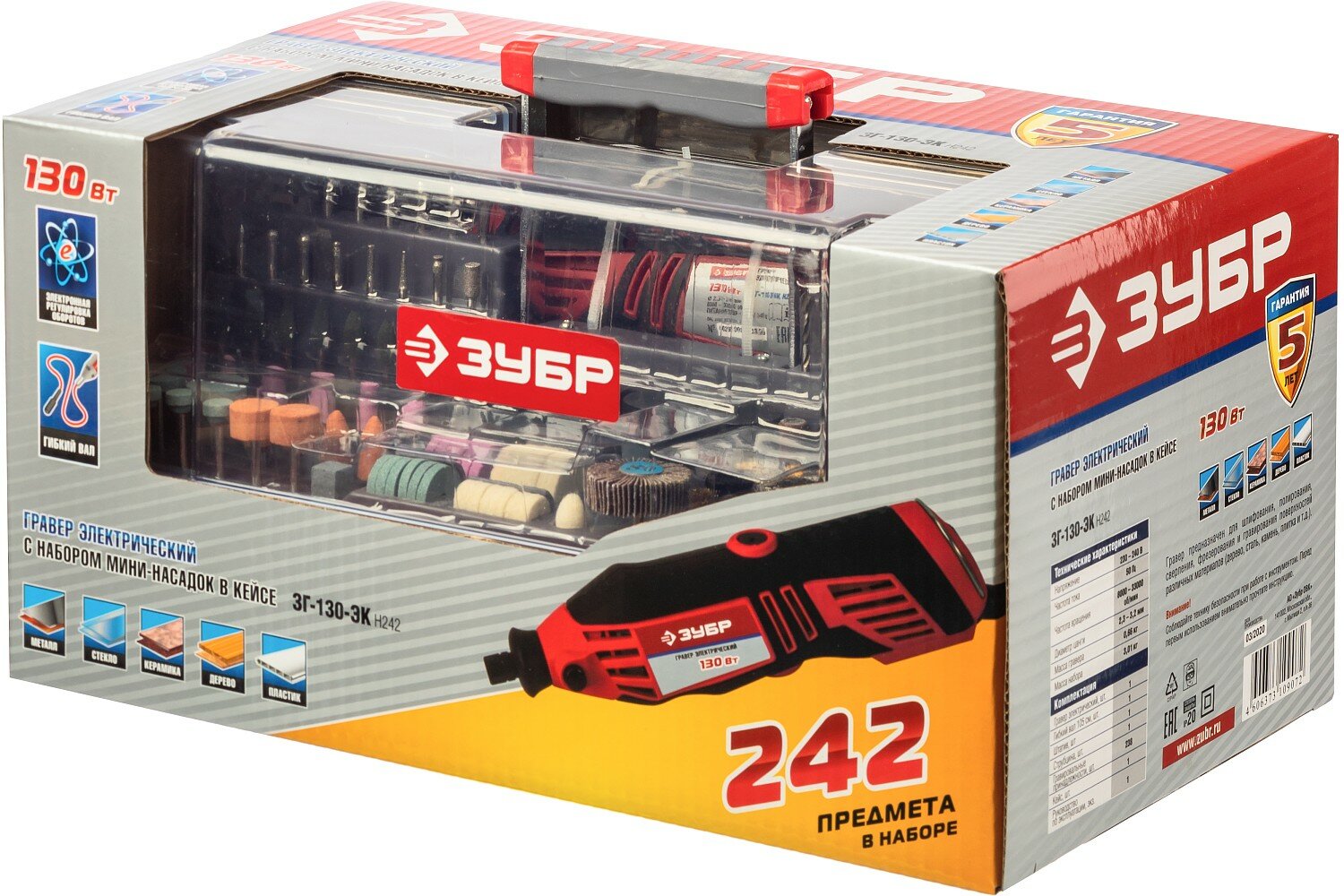 Гравер Зубр ЗГ-130ЭК H242 +набор насадок 242пр.