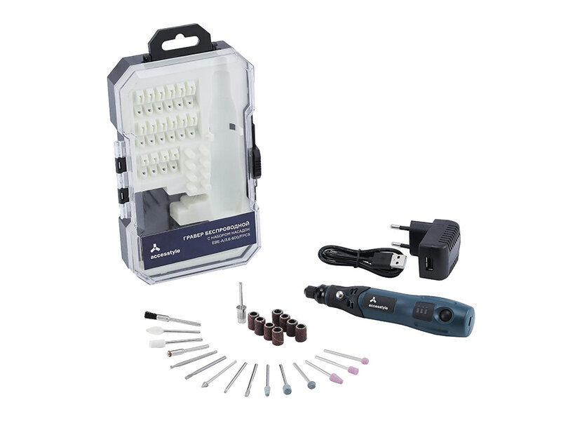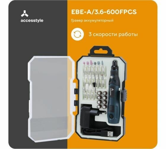 Гравер аккумуляторный Accesstyle EBE-A/3.6-600/FPCS беспроводной, 3 скорости, 3,6В в кейсе с насадками