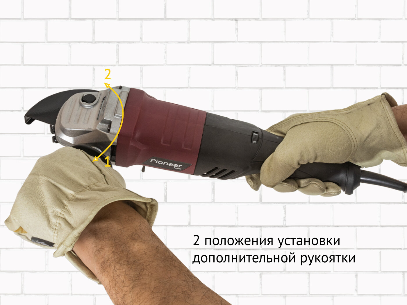 Купить Угловая шлифмашина болгарка Pioneer сетевая с щеточным двигателем, 6 уровней скорости, блокировка шпинделя, 2 положения рукоятки Anti-Slip, 1200 Вт