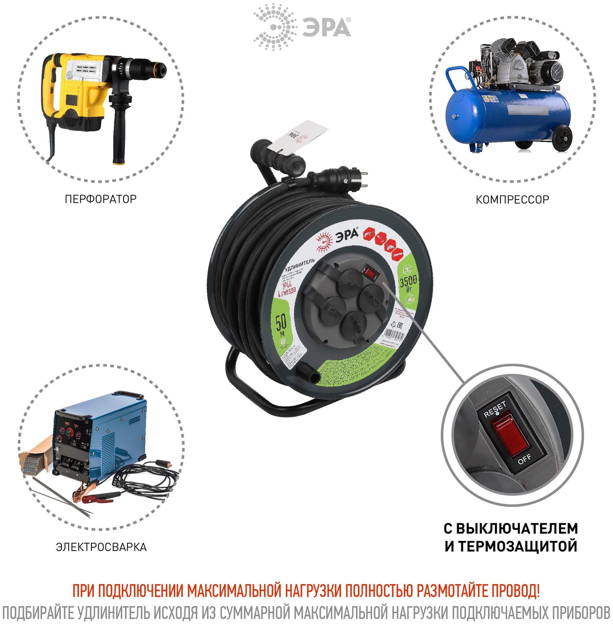 Купить Удлинитель силовой ЭРА RMx-4es-3x2.5-50m-IP44(KG) на металлической катушке с заземлением с выключателем 4 розетки 50м КГ
