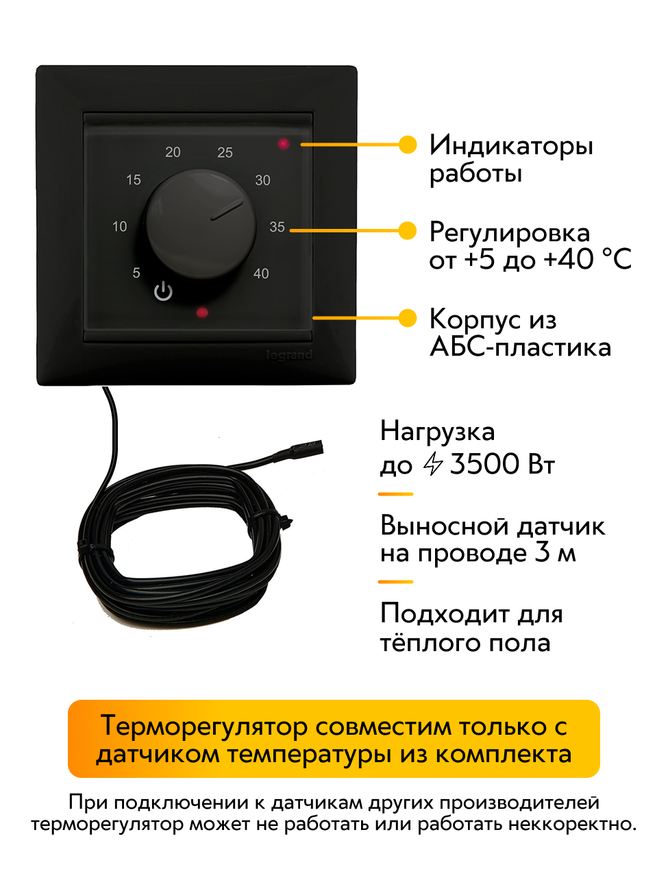 Купить Терморегулятор ЭргоЛайт ТР-03 Валена чёрный, с выносным датчиком, встраиваемый, для рамок Legrand Valena