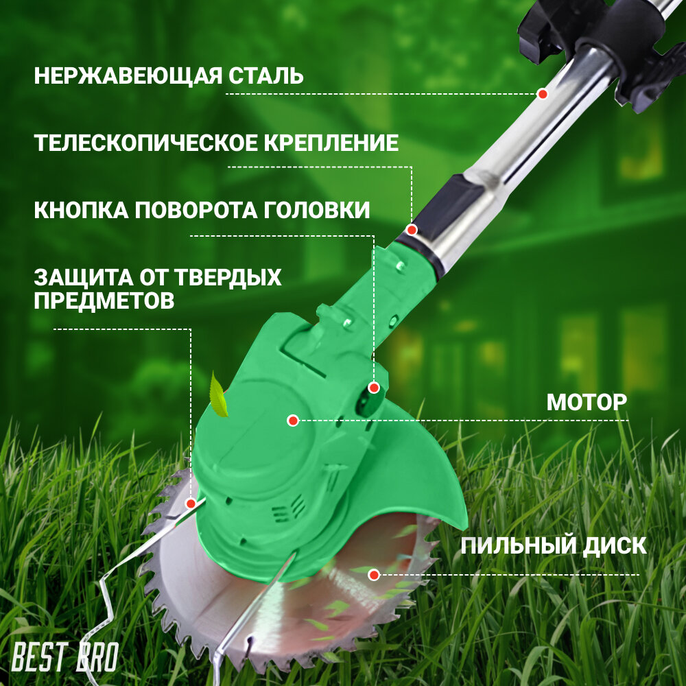 2) мощный, хорошо справляется даже с толстыми стеблями 3) 2 аккумулятора, можно спокойно работать 4) несколько насадок |
